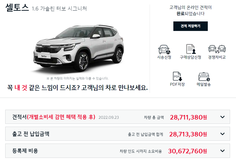 그러다가 2022년 초에 대충 어떤 차가 나에게 딱 맞을지 감이 오기 시작했다. 바로 소형 SUV인 기아 셀토스. 쉐보레 트레일블레이저 사이에서 한참을 고민을 했었지만 결국 실내디자인이 조금이라도 더 이쁜 기아의 셀토스를 계약하기로 마음을 먹었다. 대신 이번에는 시간도 많이 흘렀고 어느정도 모아둔 돈도 생겼으니 새차를 구매하는걸로 하고. 그래서 호다닥 기아자동차 홈페이지로 들어가서 셀토스 온라인 견적을 뽑아봤다.