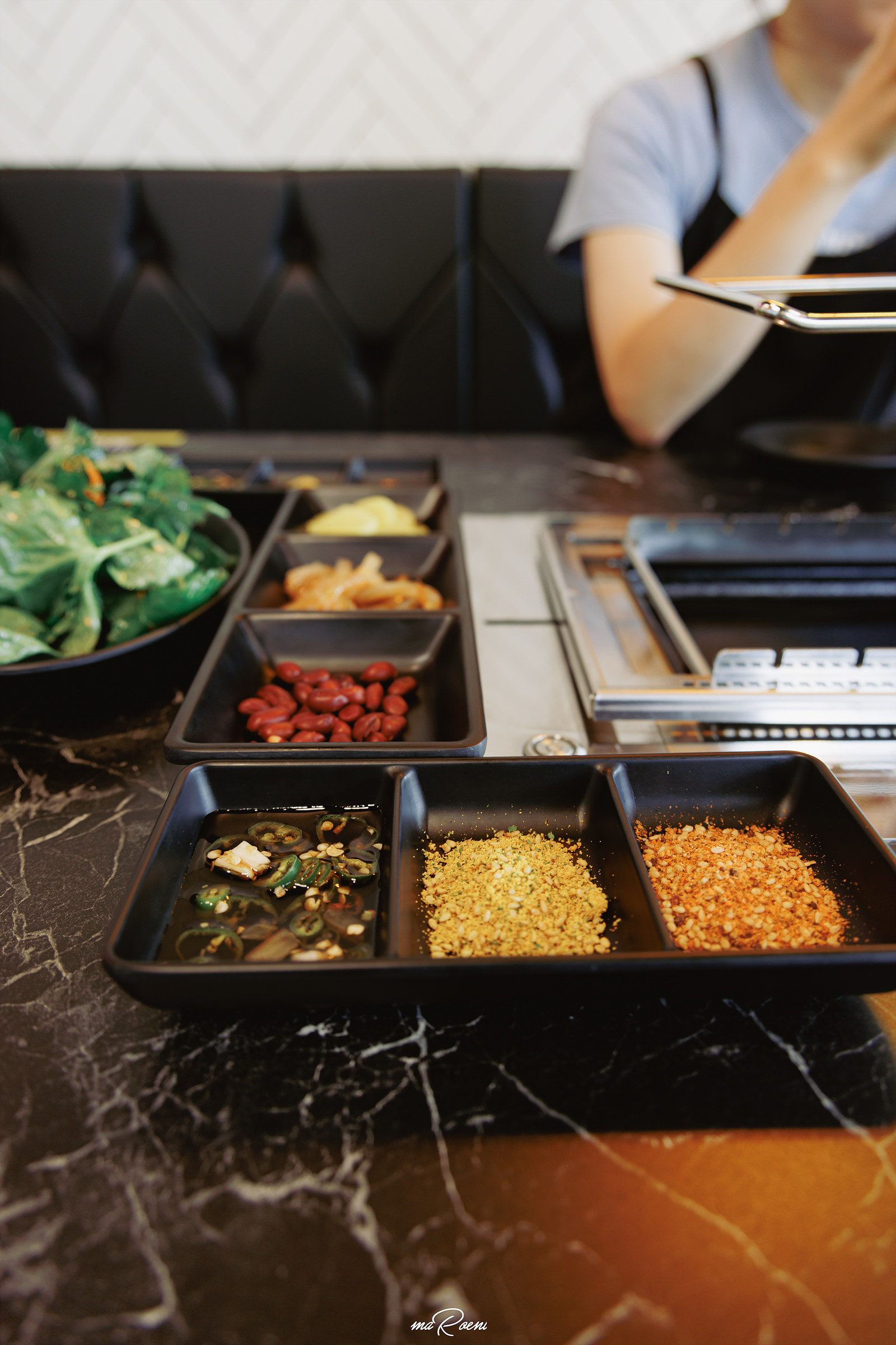 음식을 주문하면 나오는 볶은 땅콩, 무, 짜사이로 구성된 기본 반찬, 소스로는 고추와 마늘 베이스의 참소스와 쯔란, 그리고 카레가루가 나온다. 카레나 쯔란은 많이 봤지만 간장소스는 이곳이 첫경험이다.