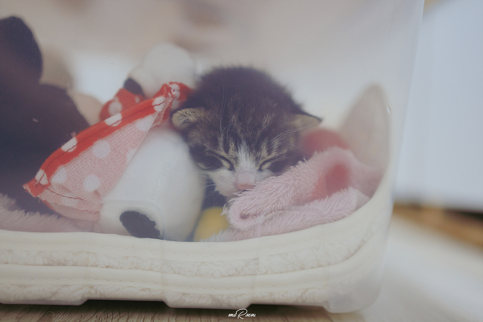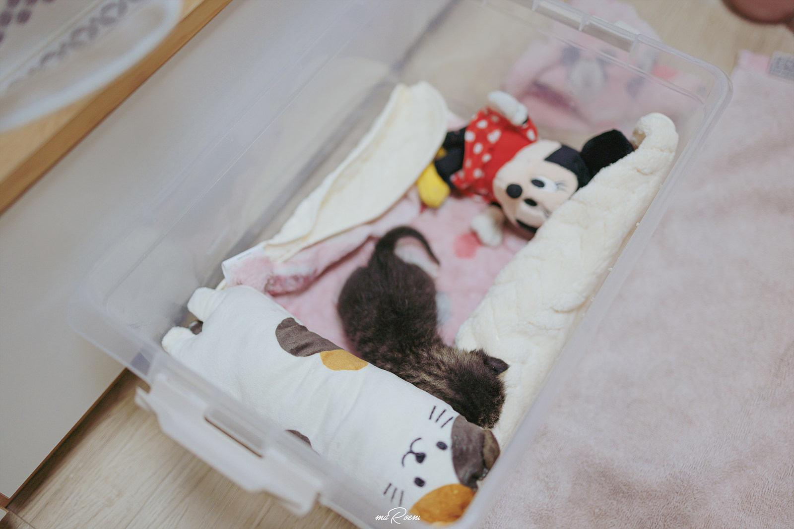 집도 새롭게 만들어줬다. 고양이들은 넓은 것보다 약간 좁은걸 좋아한다고 해서 다이소에서 작은 통을 하나 샀고 그 아래 핫팩과 부드러운 수건을 깔아줬고 외로움을 타지 않게 고양이의 크기와 비슷한 인형도 2개 넣어줬다.