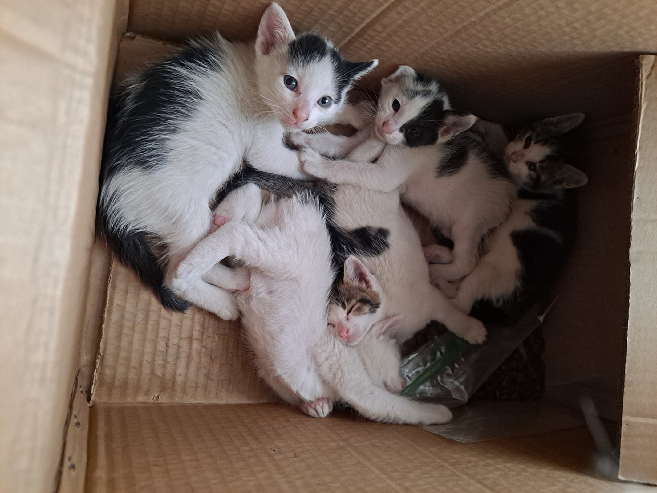 9월 26일 평소처럼 일을 하고 있었는데 창고에서 고양이 합창단 울음소리가 들렸다. 뭐지? 하는 마음으로 직원들이 전부 소리가 들리는 박스쪽으로 이동을 해보니 어미는 없고 새끼고양이 5마리가 아직 눈도 못 뜨고 바닥에 붙어서 지들끼리 체온을 나누며 바들바들 떨면서 초음파 소리로 괭괭 울고있는게 아니겠는가..?