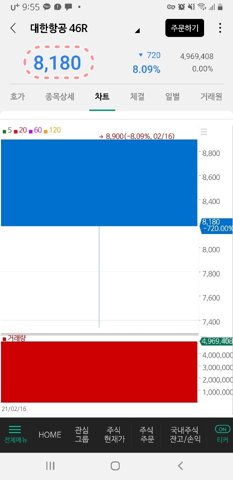 2021년 2월 16일부로 대한항공 신주를 매매할 수 있게 되었습니다. 기간은 16일부터 22일까지이며 이 글을 작성하는 시간을 기준으로 주당 8,180원인데, 이때는 자신이 배정받은 수량이 아닌 원하는 만큼 대한항공 46R 주식을 구매할 수 있는 기간으로 주당 8,180원이 아닌 8,180+19,100(발행가)을 더하는 가격으로 구매를 하는 것이니 참고하시길 바랍니다.(저는 그냥 배정받은 수량만 구매할 계획입니다.)