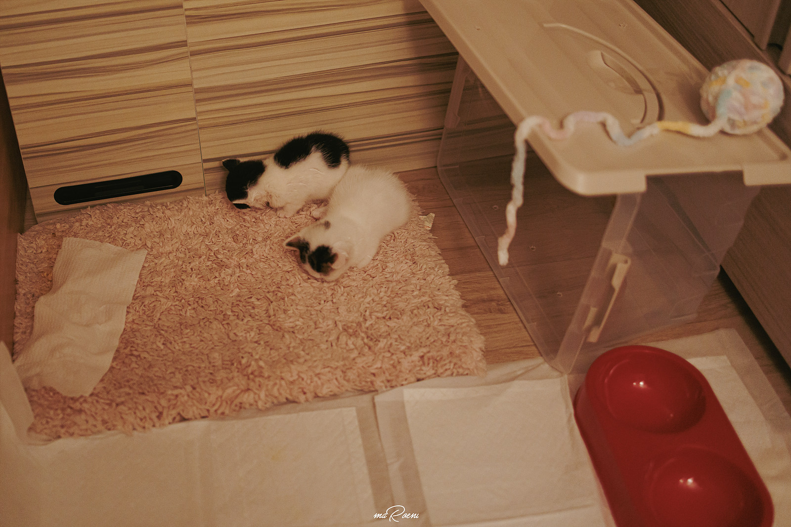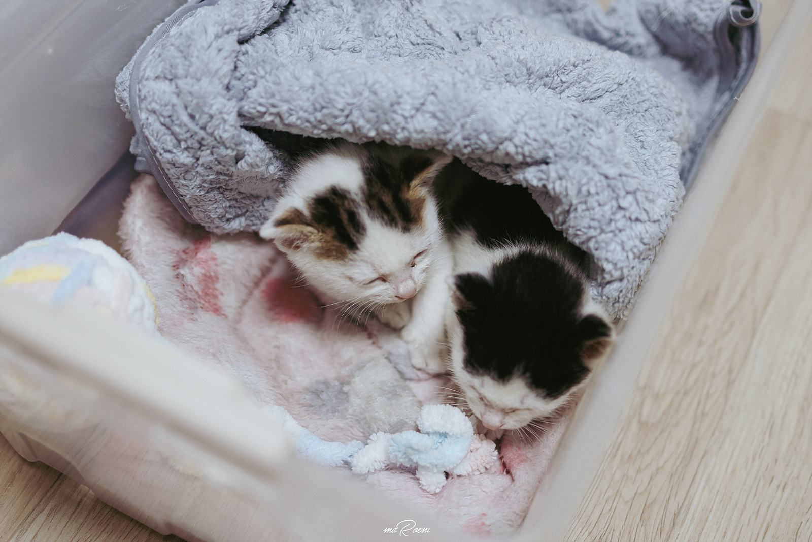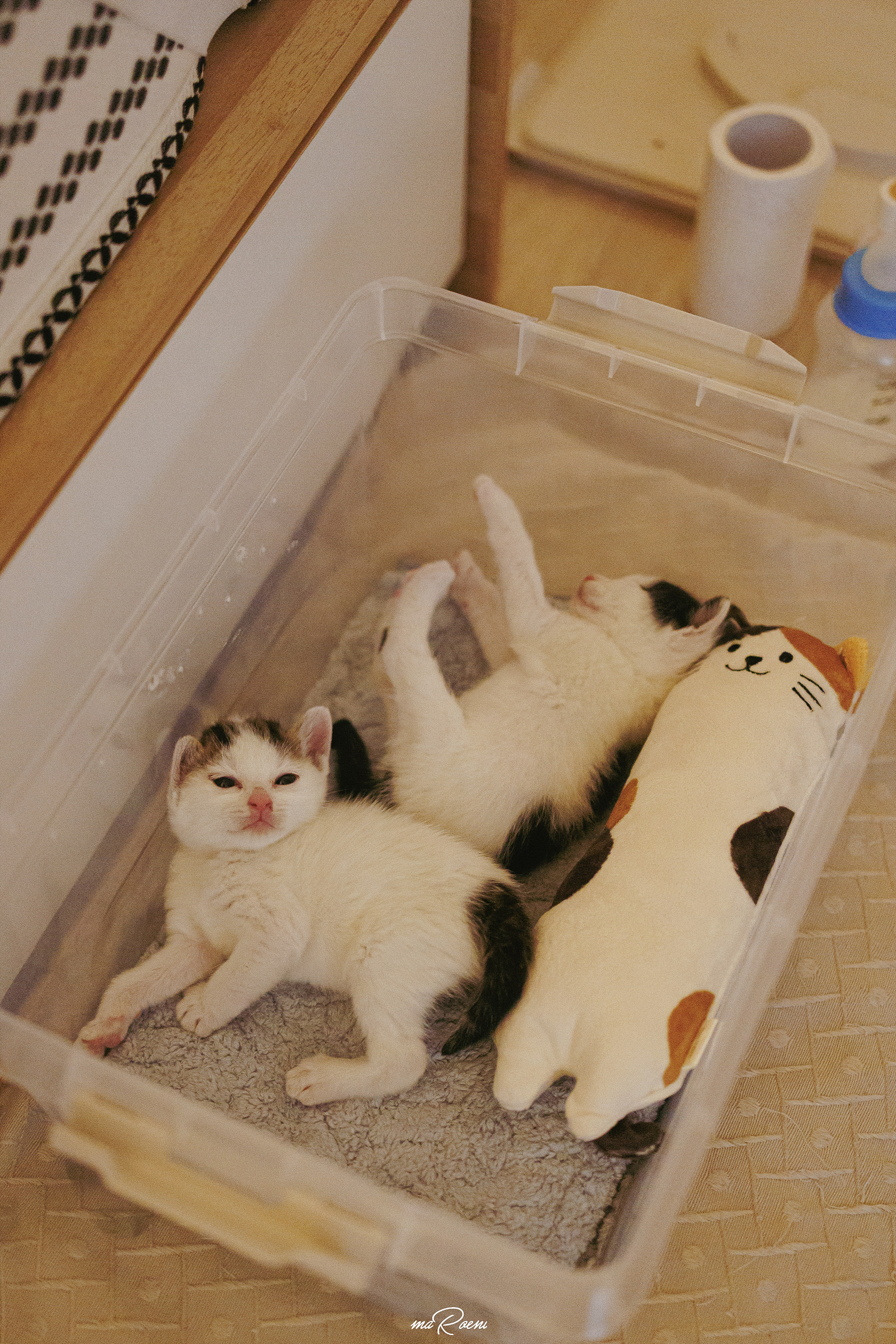 아무튼! 일단은 급한대로 집으로 데려왔는데 아무것도 먹지 못해서 그런가, 다 쉬어가는 목소리로 사람을 경계하던 녀석들. 하지만 봄이를 보호했을 때처럼 따땃한 분유와 함께 봄이가 일주일동안 지냈었던 뜨끈한 핫팩자리를 선사하니 언제 그랬냐는듯 조용히 잠을 자더라.