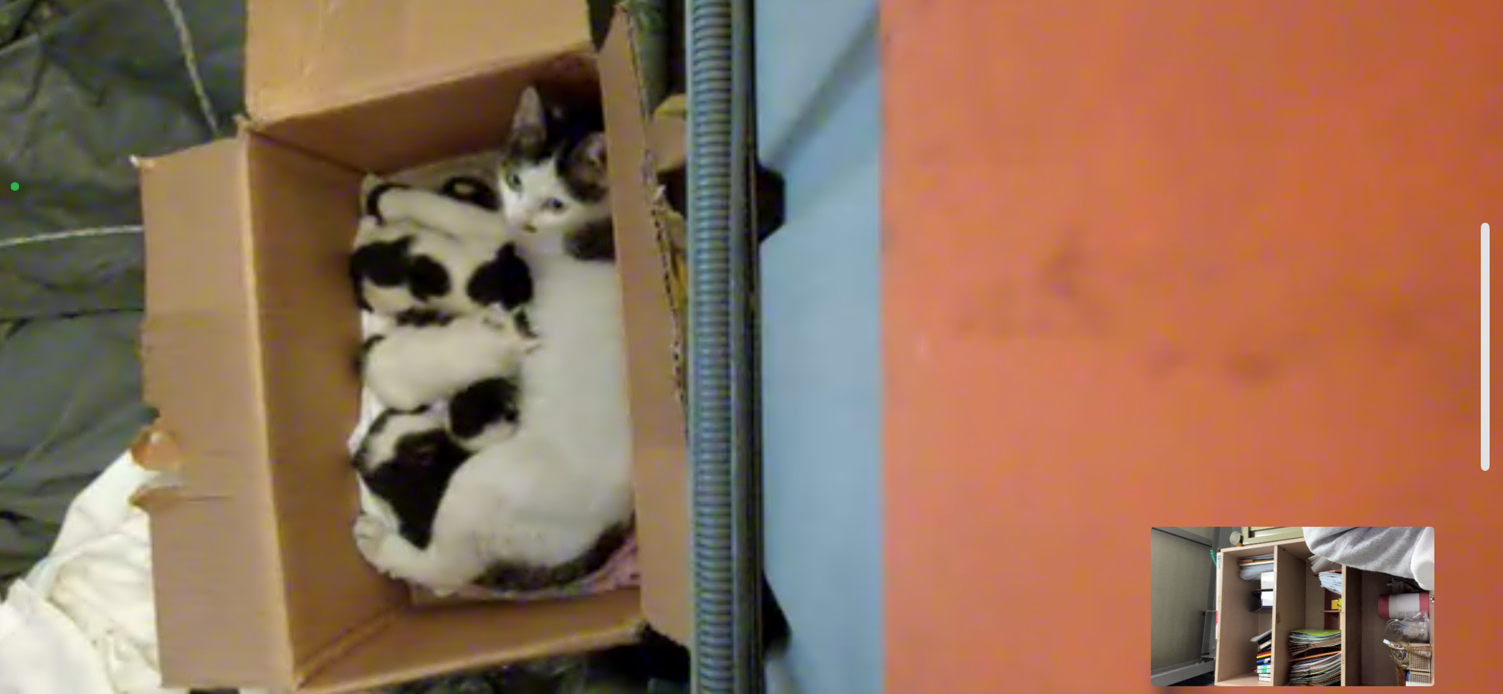 직원이 말한대로 어미가 발견된 위치로 가보니.. 사라졌던 4마리의 새끼들과 함께 어미고양이 한마리가 있더라. 심장이 마구마구 뛰더라. 나는 서둘러 사무실로 돌아가 봄이를 어미에게 합사시킨 후 혹시 모를 상황에 대비해 공기계 휴대폰을 임시 CCTV로 활용하여 봄이와 녀석의 가족들을 지켜봤다. 그러자 놀라운 일이 발생했다. 어미로 보이는 녀석도 봄이를 발견한 후 킁킁 냄새를 맡더니 자연스럽게 박스로 들어가 새끼들에게 젖을 물리는게 아니겠는가?! 무려 일주일이나 사람 손을 탔던 새끼고양이였음에도 불구하고 어미는 자연스럽게 자신의 새끼를 품었다.