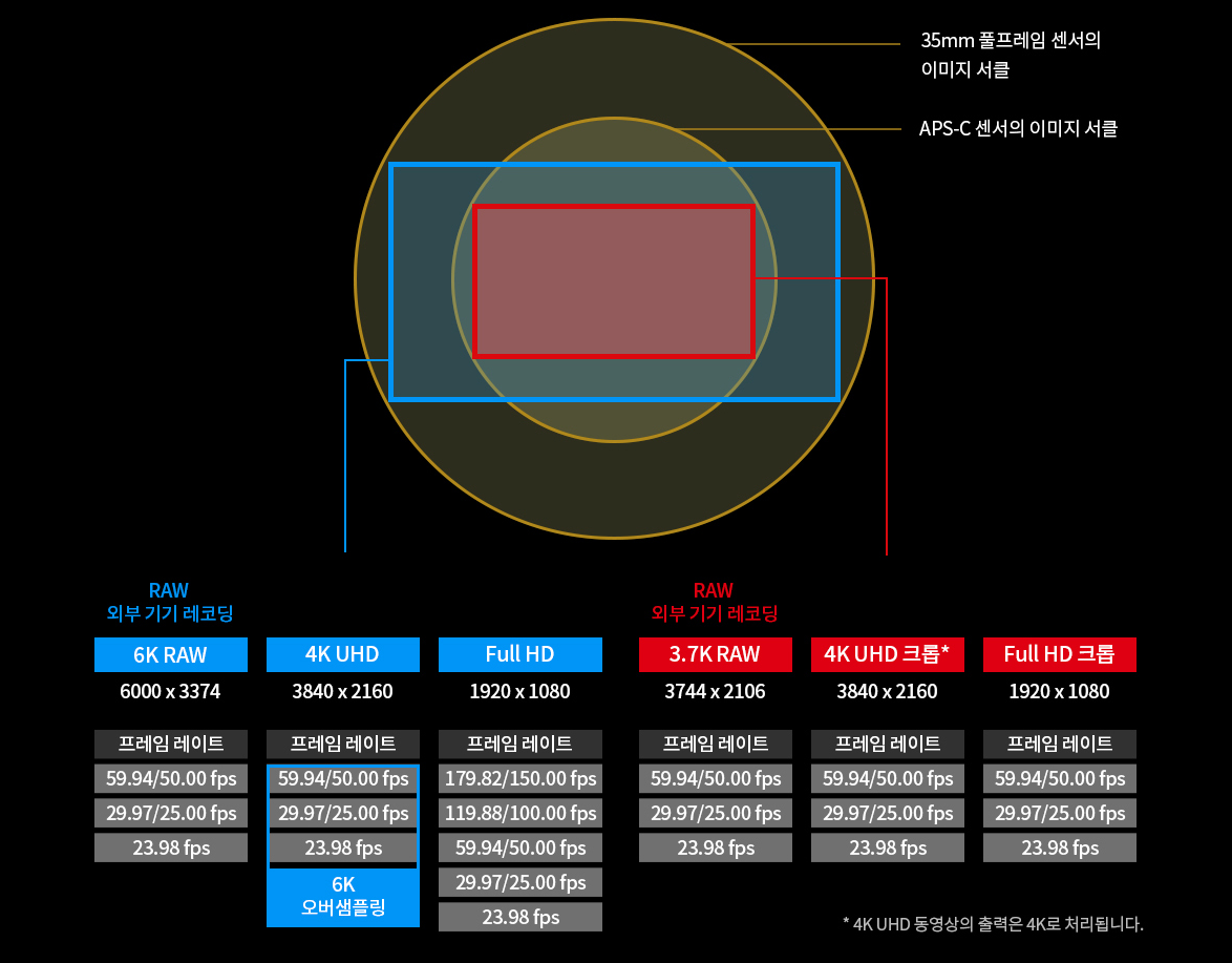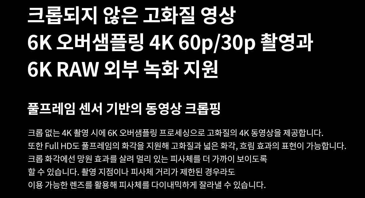 - 6K RAW 외부 기록 및 4K60p 동영상