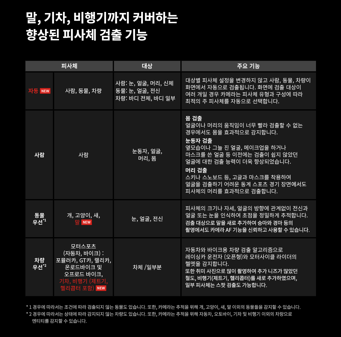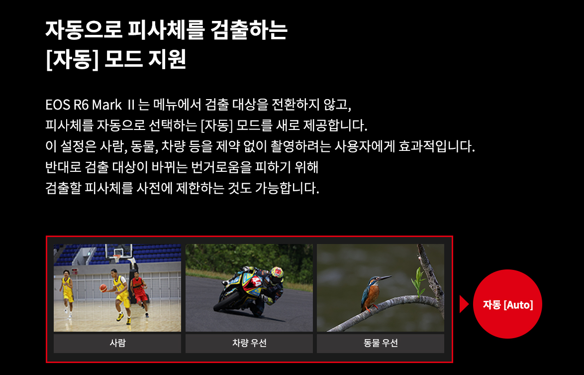 AF는 전작인 EOS R6부터 좋았기에 딱히 언급할 부분은 없는 것 같다. 대신 피사체 검출이 동물/사람/차량에서 끝나는게 아니라 말과 기차, 그리고 비행기까지 추적한다고 한다. AF가 자동일 경우엔 근본 없이 이런저런 피사체를 추적하지 않고 우선 지정 피사체부터 포커싱을 잡는 기능을 추가한 것으로 보인다.