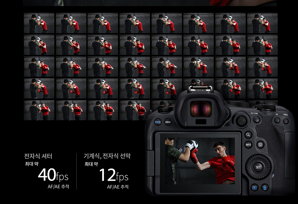40연사는 말이 안나올 정도로 부럽더라. R6가 1초에 20연사였던 것 같은데 40연사라니! 기계식이 12연사고 전자식이 40연사지만 태생이 적층형 센서가 아니기 때문에 EOS R3와 비교한다면 성능이 당연히 떨어질 수밖에 없다. 다만 전작인 R6의 전자셔터도 나쁜 편이 아니었기에, 개선된 EOS R6 Mark2의 전자셔터 성능도 기대해볼 만하다. 예시 자료처럼 빠르게 움직이는 공이 아닌, 움직이는 사람 정도는 왜곡 없이 잡아낼 수 있을 듯.