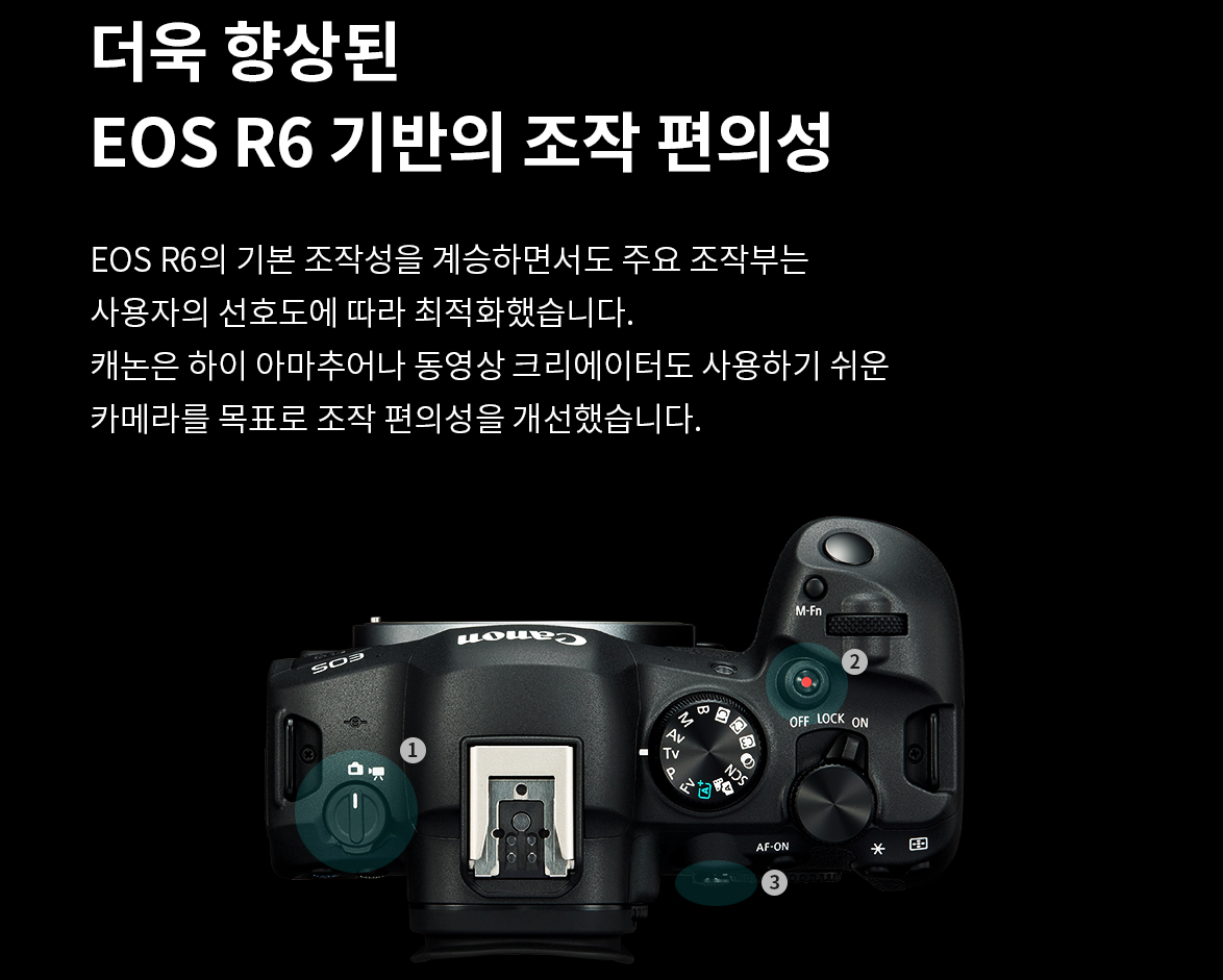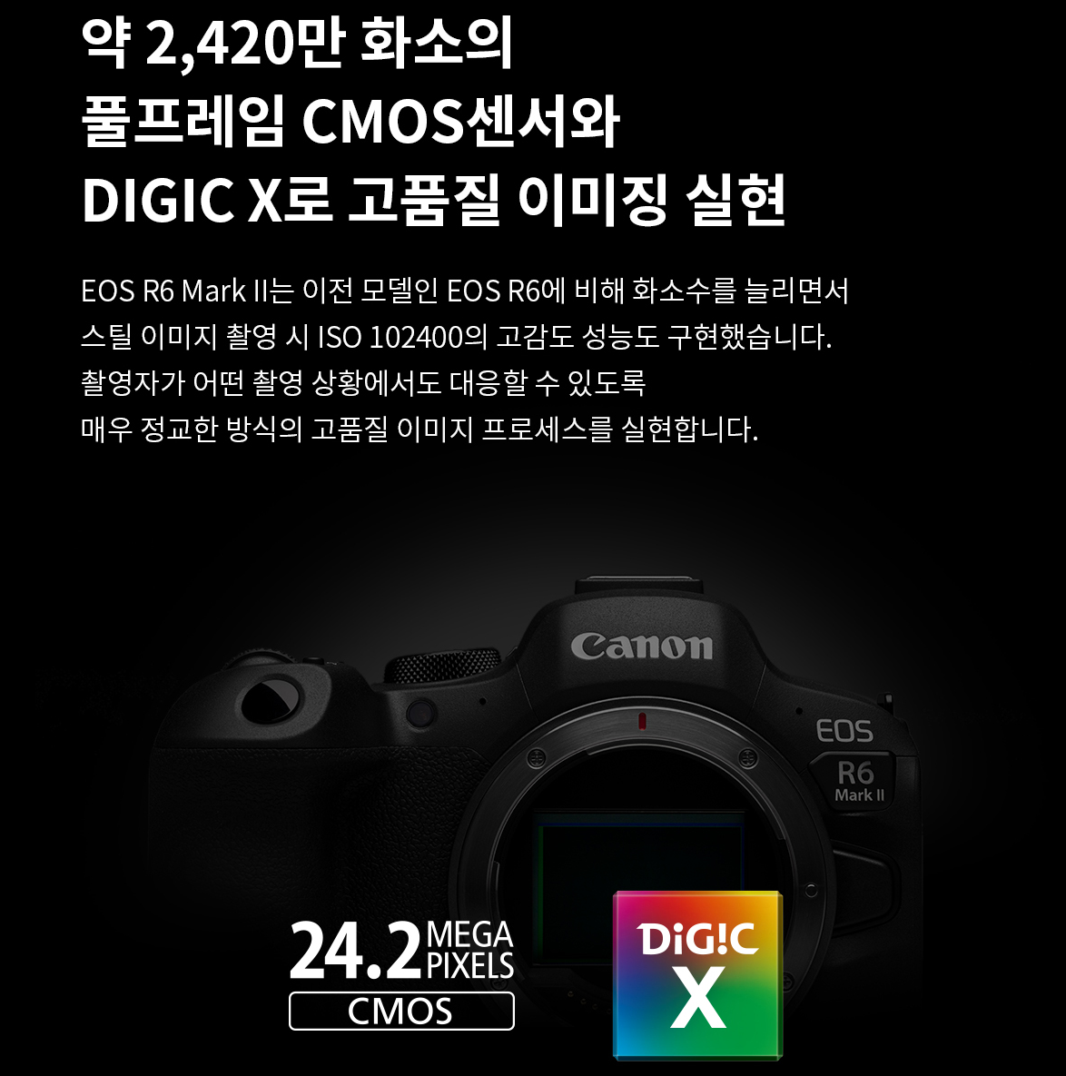 화소의 변화는 상당히 반가운 소식이다. 전작인 EOS R6의 경우엔 2,000만 화소를 아쉬워하는 사람들이 많았고 2,400만 화소 정도만 되어도 구매하고 싶다는 의견들이 많았는데, 다행히도 R6M2에서는 2,420만화소의 풀프레임 CMOS센서를 탑재했다.