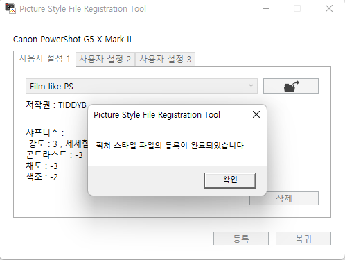 카메라의 촬영 모드가 AUTO로 되어있는지 확인해보자. 무슨 이유에서인지는 모르겠지만 Picture Style File Registration Tool 소프트웨어가 AUTO 모드에서는 작동을 하지 않는 모양이더라. 아무튼, AUTO 모드를 제외한 다른 모드로 설정한 후 다시 PC에서 실행 중인 소프트웨어로 돌아와 보면..