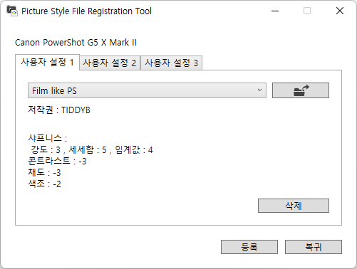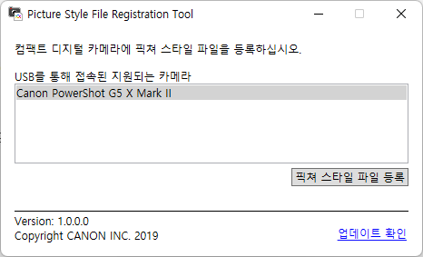 설치한 Picture Style File Registration Tool를 실행하고 PC와 연결한 카메라를 선택 후 픽쳐스타일 파일 등록 버튼을 눌러준다.