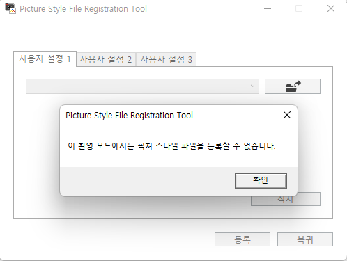 만약 "이 촬영 모드에서는 픽쳐스타일 파일을 등록할 수 없습니다." 라는 에러 메시지가 나오면..