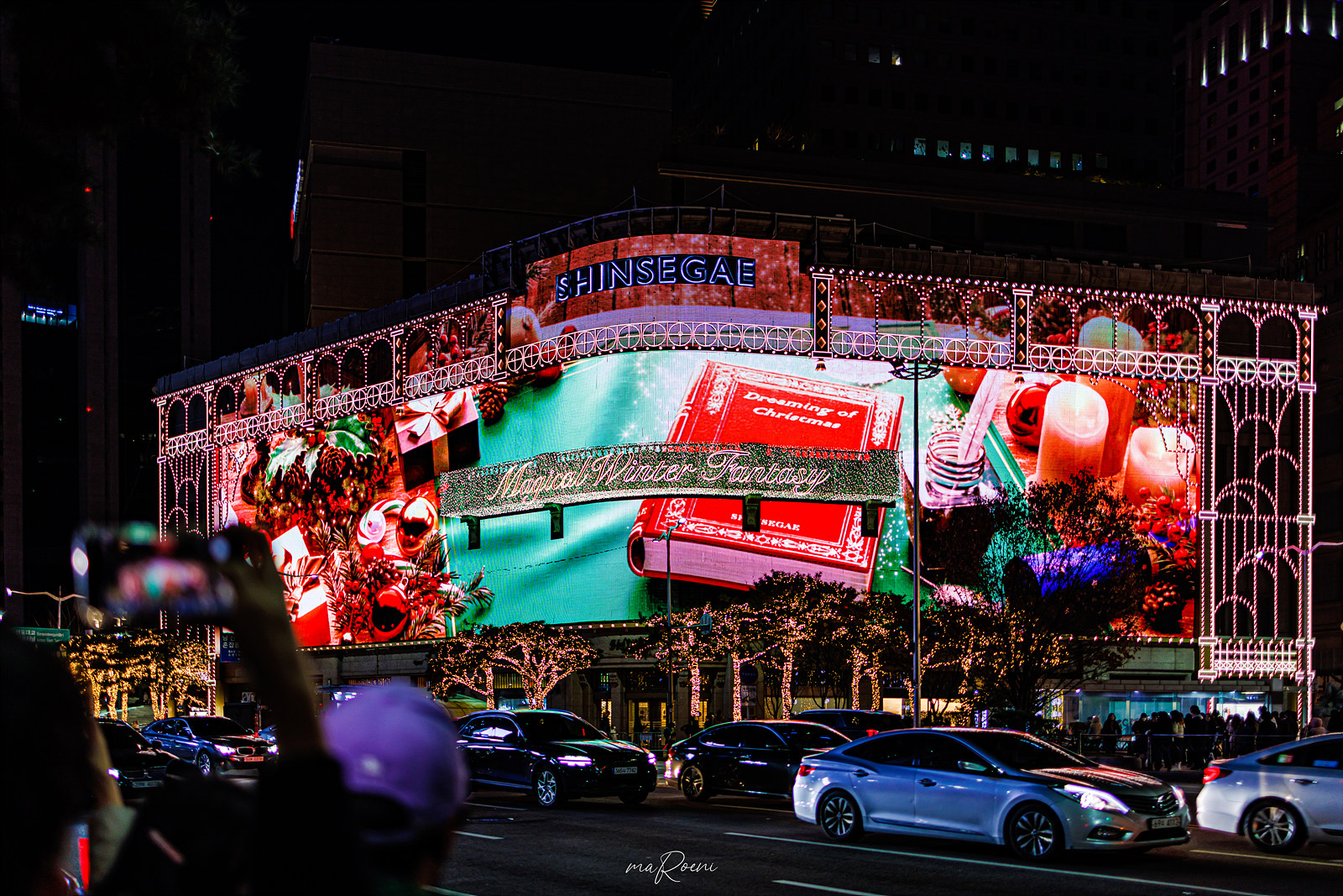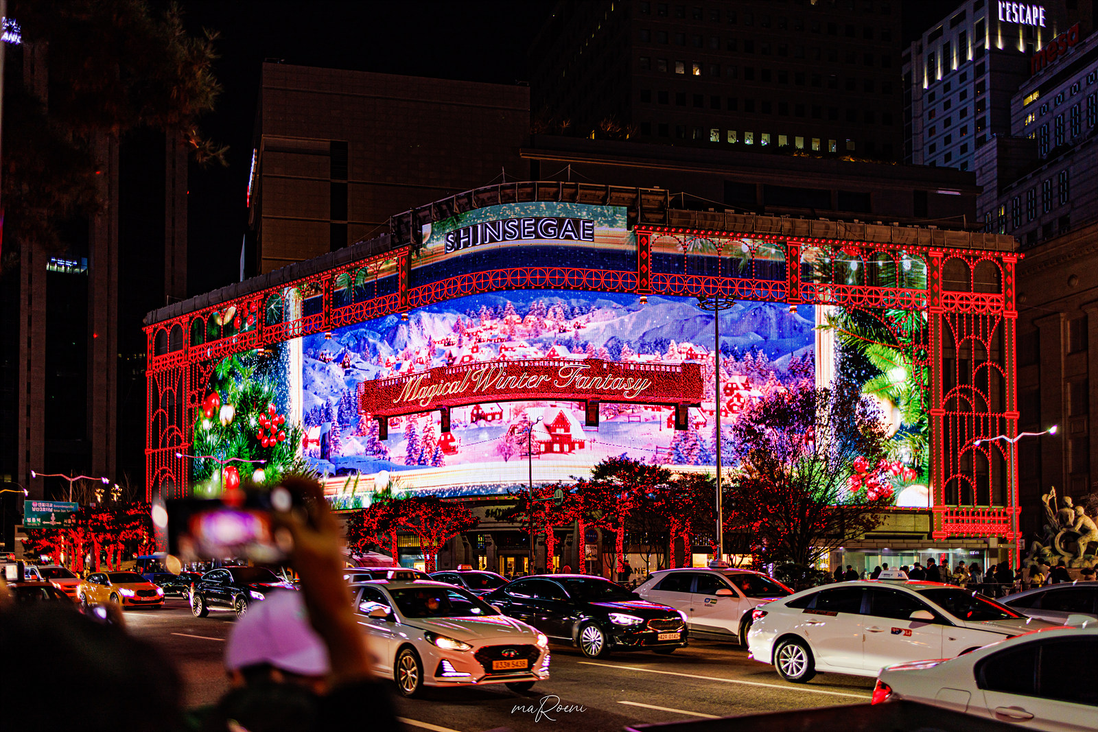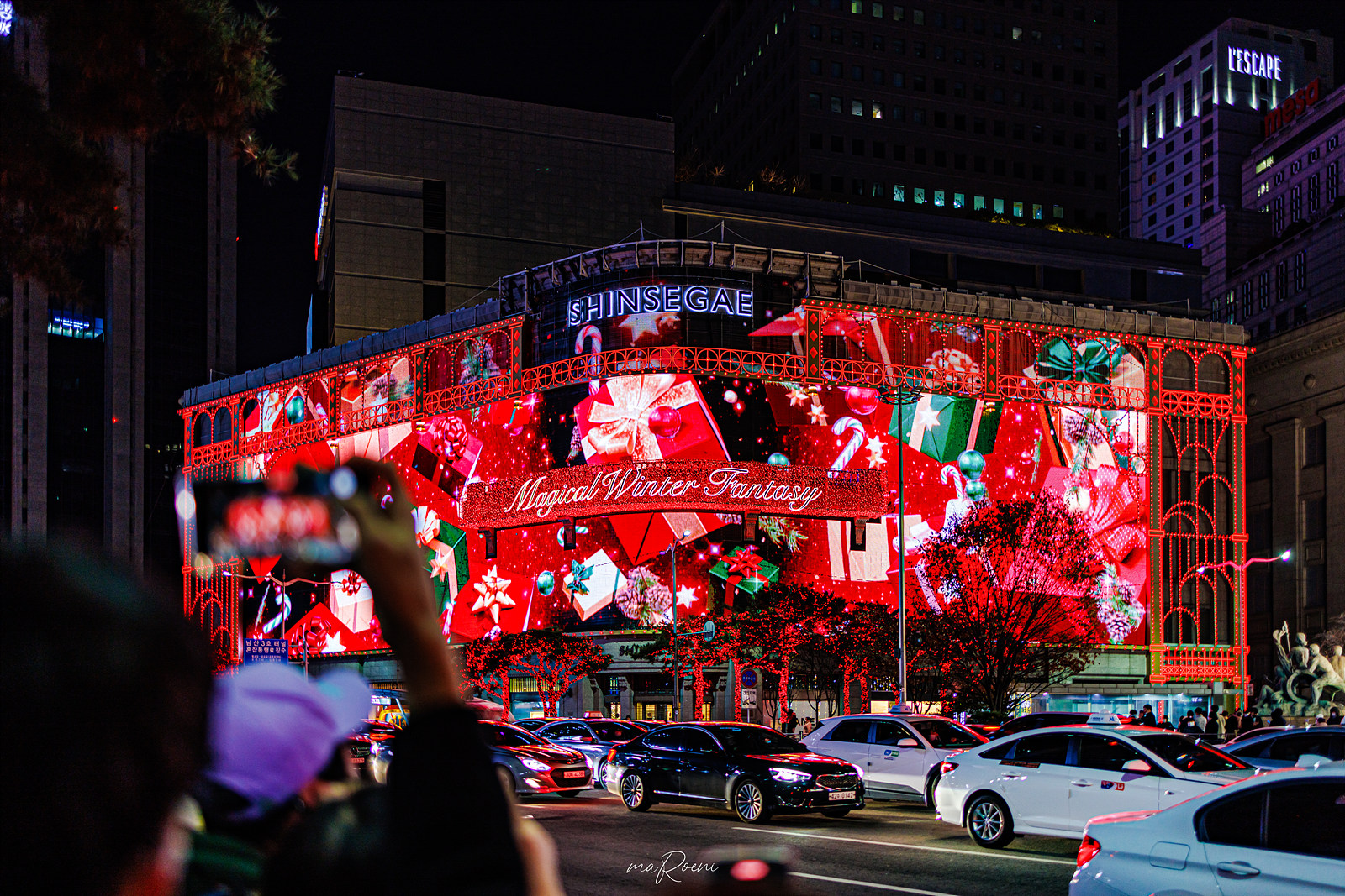 명동에서 크리스마스 분위기를 가장 잘 느껴볼 수 있는 곳이 어디냐고 물어본다면, 모두가 입을 모아 명동 신세계백화점 본점 크리스마스 미디어파사드를 말할 것이다. 백화점의 쌍두마차라 볼 수 있는 롯데백화점과 신세계백화점이 건물의 외관을 크리스마스 느낌의 대형 스케일 미디어 아트로 꾸며놓았는데, 롯데백화점은 다소 심심한면이 있지만 신세계백화점은 클라스가 다르다.