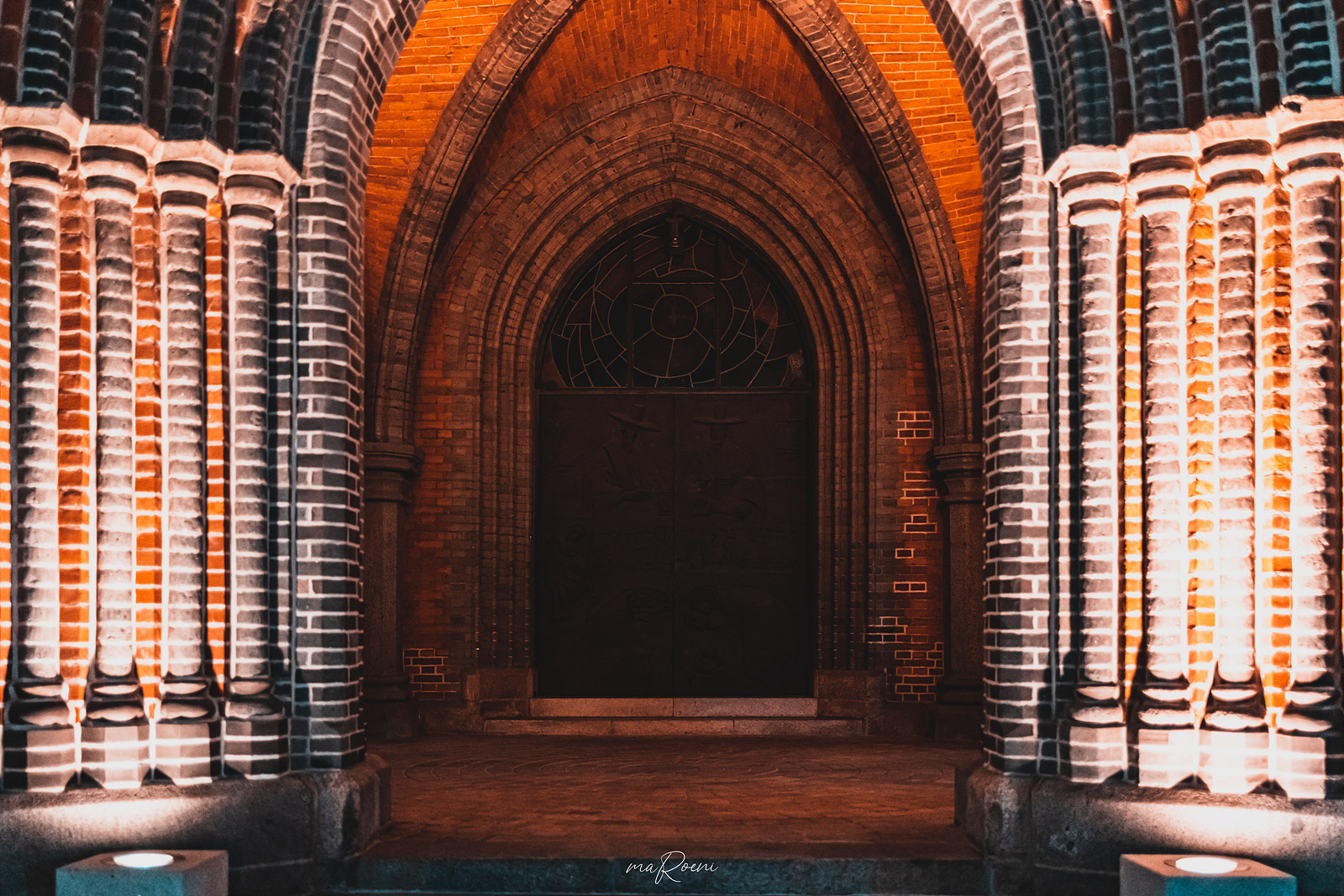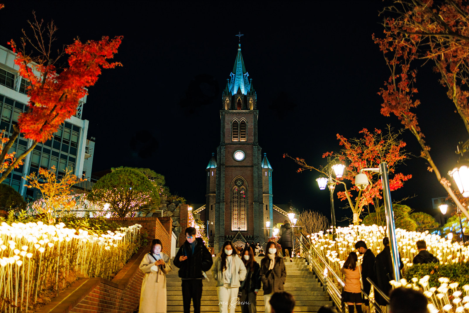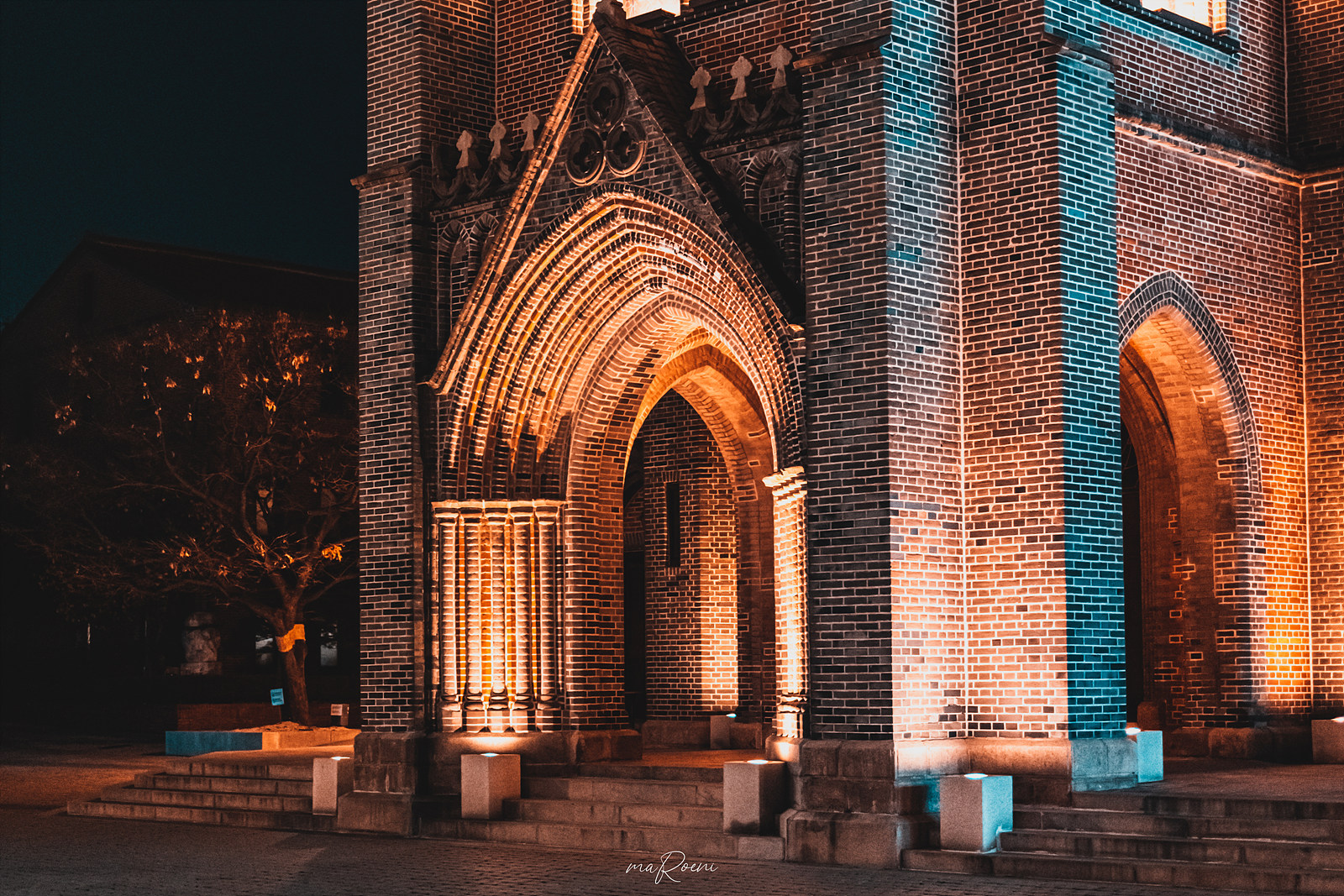 계단에서 양 옆에 펼쳐진 장미 조명은 명동성당의 포토스팟으로도 유명한데, 이 조명은 김수환 추기경을 기리기 위해 만든 LED 장미 조명으로 약 4,000개가 심어져있다고 한다.