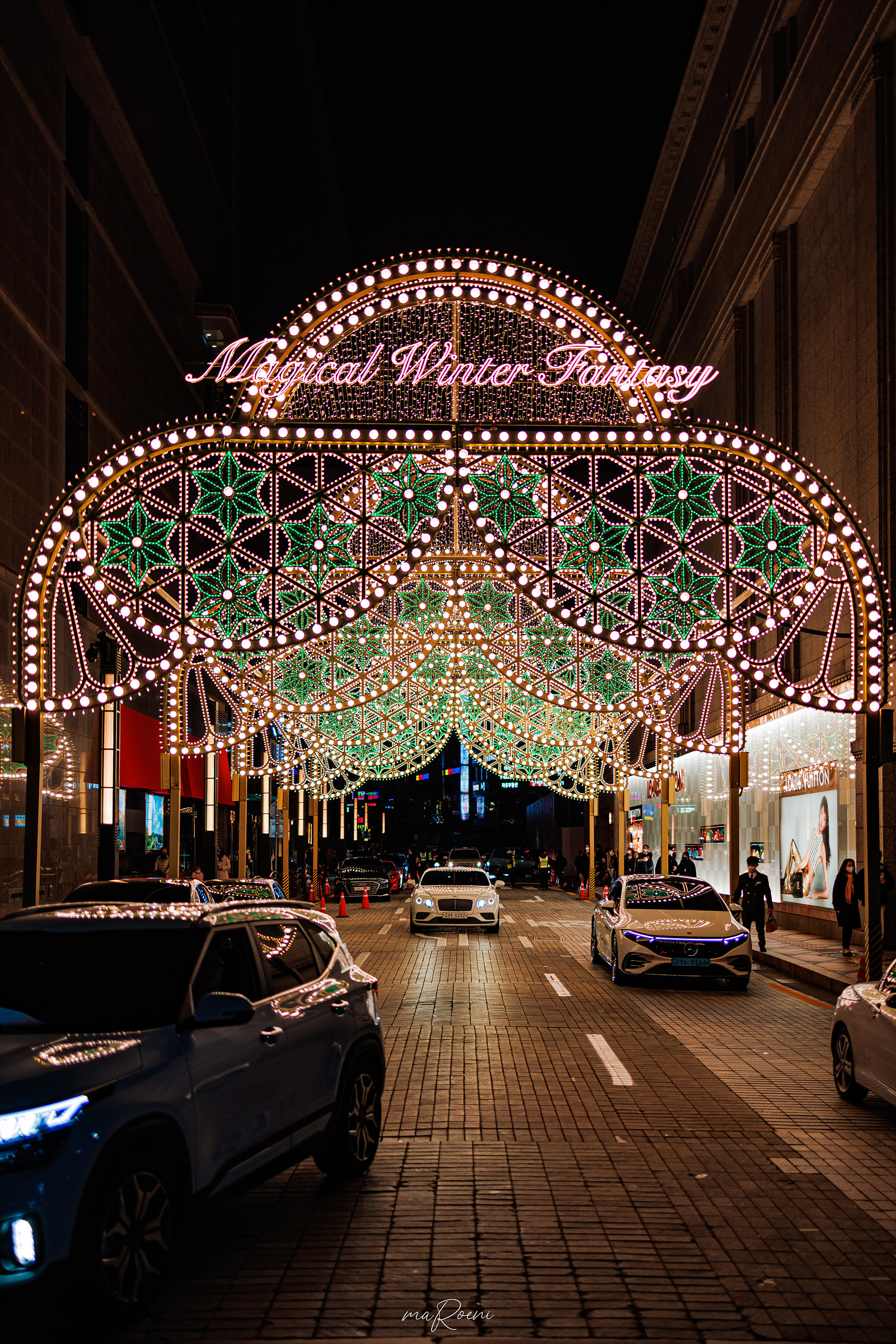 나는 4호선을 타고 회현역 1번 출구에서 내려서 5분 정도 걸었는데 가장 먼저 Macical Winter Fantasy라는 문구가 적힌 포토스팟을 볼 수 있었다. 구관과 신관을 이어주는 도로이기 때문에 사진을 찍을 수는 없지만, 너무 이쁘게 꾸며져 있어서 이곳을 지나치는 많은 이들이 명동 신세계백화점 미디어파사드를 보기 전, 이곳에서 간단한 인증샷을 남기기도 한다.