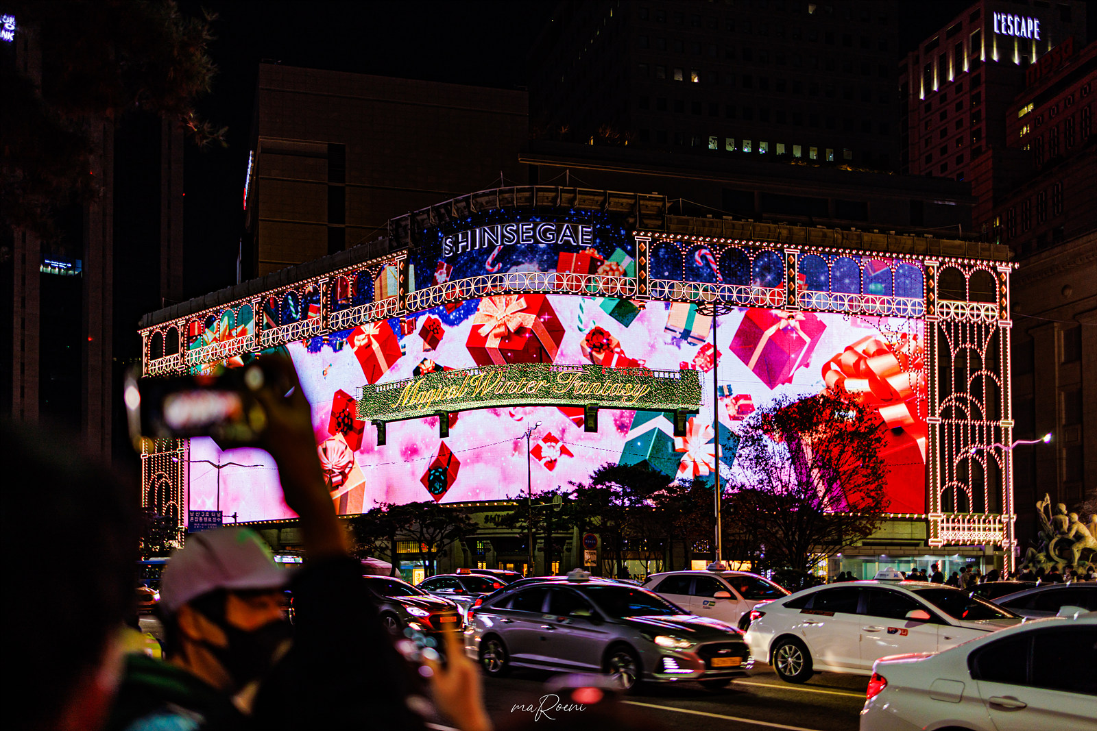 나도 사람들을 피해 이곳저곳에서 사진 촬영을 시도해봤지만 신세계백화점 크리스마스 미디어파사드를 관람하기 위해 명동으로 찾아온 사람들이 정말 많아서 메인 피사체보다는 사람들의 뒤통수만 엄청 찍어댔던 것 같다. 15분 정도 기다린 끝에 사진이 잘 나올만한 자리를 차지할 수 있었지만 그래도 계속 사람들을 피해서 촬영을 할 수 없었기 때문에 조금은 아쉬웠던 것 같다.