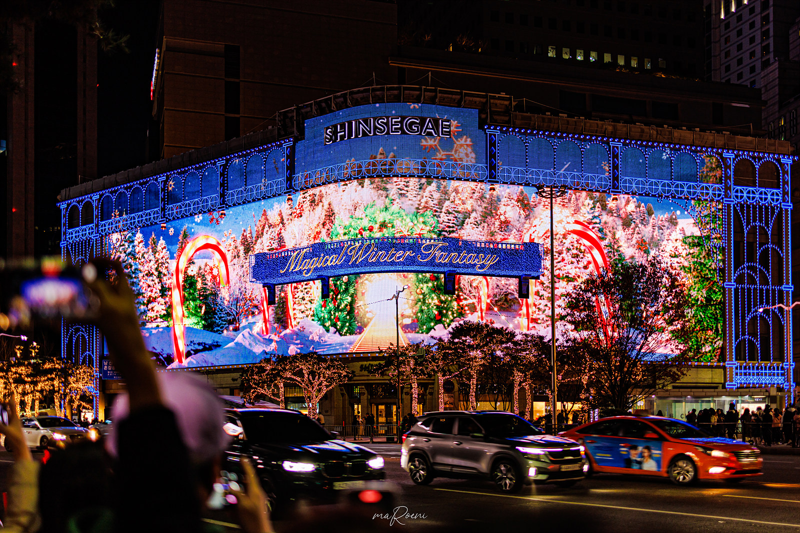 명동에서 크리스마스 분위기를 가장 잘 느껴볼 수 있는 곳이 어디냐고 물어본다면, 모두가 입을 모아 명동 신세계백화점 본점 크리스마스 미디어파사드를 말할 것이다. 백화점의 쌍두마차라 볼 수 있는 롯데백화점과 신세계백화점이 건물의 외관을 크리스마스 느낌의 대형 스케일 미디어 아트로 꾸며놓았는데, 롯데백화점은 다소 심심한면이 있지만 신세계백화점은 클라스가 다르다.