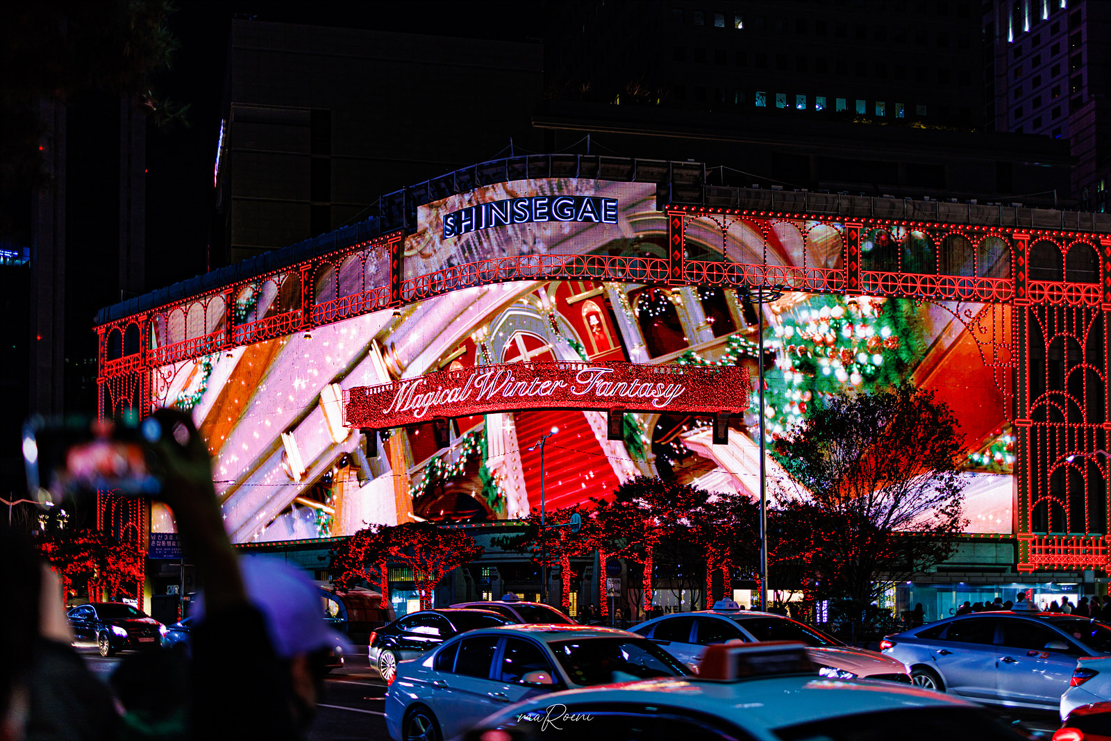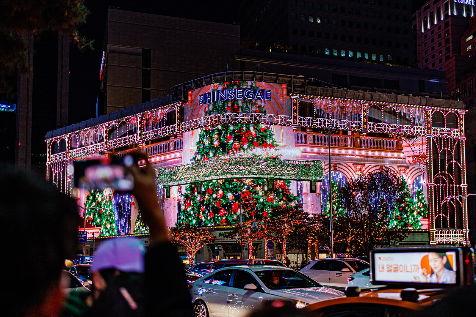 나도 사람들을 피해 이곳저곳에서 사진 촬영을 시도해봤지만 신세계백화점 크리스마스 미디어파사드를 관람하기 위해 명동으로 찾아온 사람들이 정말 많아서 메인 피사체보다는 사람들의 뒤통수만 엄청 찍어댔던 것 같다. 15분 정도 기다린 끝에 사진이 잘 나올만한 자리를 차지할 수 있었지만 그래도 계속 사람들을 피해서 촬영을 할 수 없었기 때문에 조금은 아쉬웠던 것 같다.