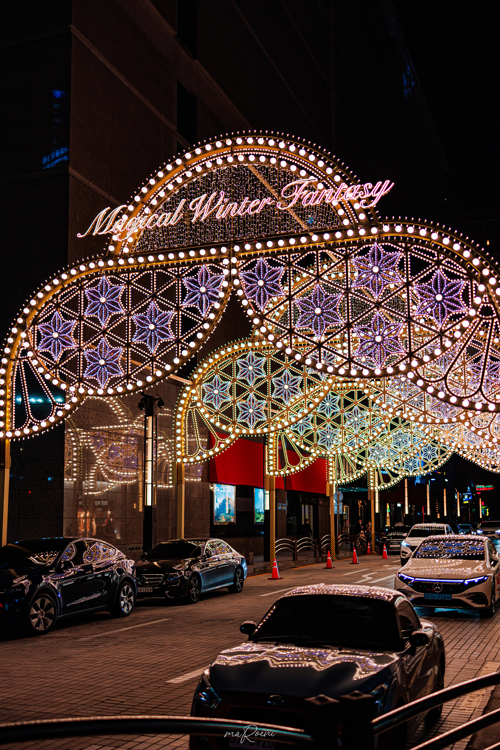 나는 4호선을 타고 회현역 1번 출구에서 내려서 5분 정도 걸었는데 가장 먼저 Macical Winter Fantasy라는 문구가 적힌 포토스팟을 볼 수 있었다. 구관과 신관을 이어주는 도로이기 때문에 사진을 찍을 수는 없지만, 너무 이쁘게 꾸며져 있어서 이곳을 지나치는 많은 이들이 명동 신세계백화점 미디어파사드를 보기 전, 이곳에서 간단한 인증샷을 남기기도 한다.