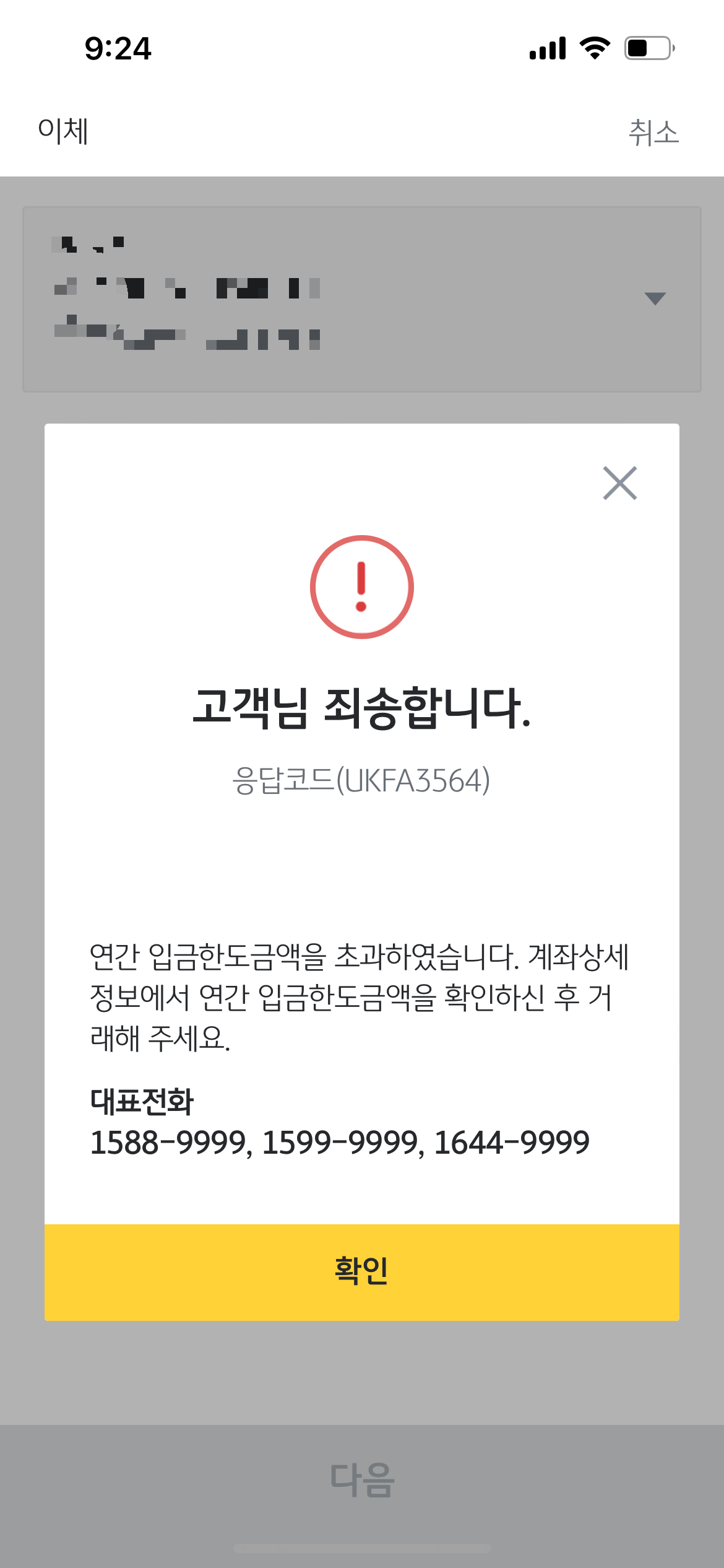 매달 1일마다 납입을 하기에, 2월 1일인 오늘도 이전과 똑같이 납입을 하려고 했으나 요상하게도 연간 입금한도금액을 초과했다는 오류메시지가 나타났다. 분명 가입하면서 한도금액을 따로 설정하지는 않았던 것 같은데, 무슨 한도 금액을 말하는 건지 이해가 가질 않았다. 그래서 고객센터에 전화를 해봤다.