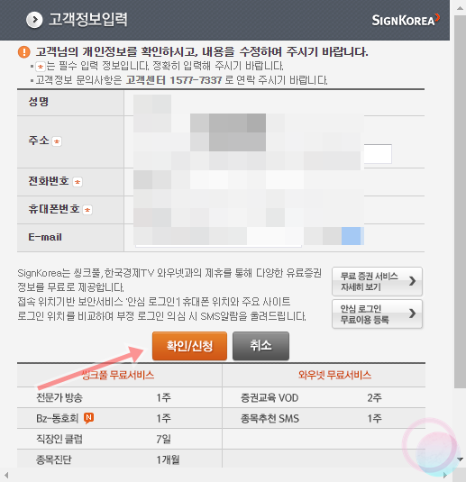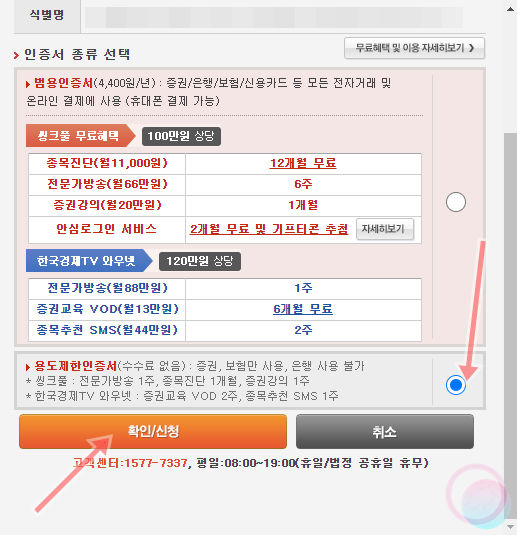 7) 여기서 끝이 아닙니다. 공동인증서를 범용(유료)로 사용할 것인지, 용도제한(무료)로 사용할 것인지를 선택해야만 주식 거래용 공동인증서를 발급받을 수 있습니다. 이 창을 그냥 닫아버리게 되면 공동인증서가 발급되지 않으니 반드시 용도를 체크한 후 확인/신청을 눌러주세요. 저는 용도제한으로 발급을 받았으며 이름과 주소, 전화번호와 이메일을 입력하니 끝났습니다.