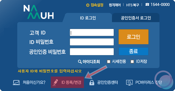 2) 설치가 끝나고 나면 다음과 같은 화면이 실행됩니다. 기존에 모바일에서는 거래 비밀번호만 가지고 있으면 됐는데 PC에서는 로그인ID가 별도로 필요하기에 ID 등록/변경을 눌러줍니다.