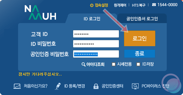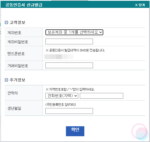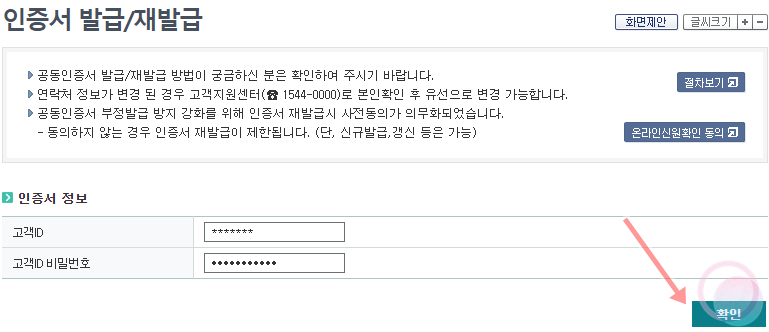 4) PC에서 주식 거래를 하기 위해서는 공동인증서(공인인증서)가 필요한데요. 일반적인 공동인증서가 아닌 주식 거래용 공동인증서가 필요하기 때문에 인증서 발급 페이지(바로가기)에서 생성한 ID와 비밀번호를 입력하고 확인을 눌러줍니다.