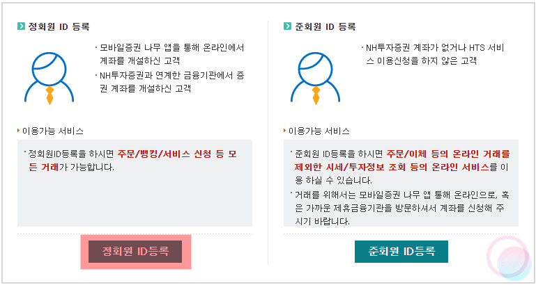 3) 모바일앱으로 계좌를 만들었다고 하더라도 앞서 말했던 것처럼 ID 생성은 별도로 진행해야 하기 때문에 설명을 꼼꼼하게 읽어본 후 정회원 ID등록을 눌러줍니다. 이후 개인정보를 입력하여 회원가입을 진행해주세요.