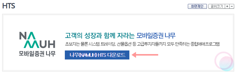 1) 모바일증권 나무 홈페이지(바로가기)에서 사진에 표시된 부분을 클릭하여 나무HTS 설치 프로그램을 다운받아줍니다. 실행하면 자동으로 설치가 진행되기 때문에 따로 설명할 필요는 없을 듯 합니다.