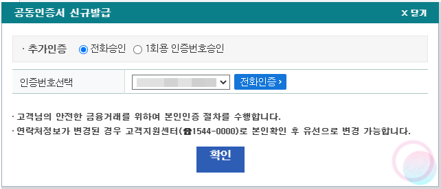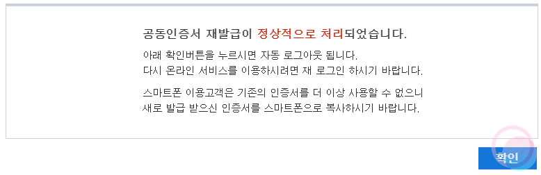 8) 모든 과정이 끝났다면 성공적으로 공동인증서가 발급되었다는 메시지가 나타납니다.(저는 위의 과정에서 실수로 취소 버튼을 눌러서 발급이 아닌 재발급으로 처리가 되었네요.)