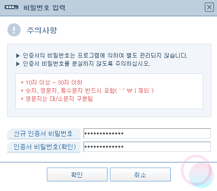 6) 생성된 공동인증서를 원하는 위치에 저장하고 새로운 비밀번호를 생성해줍니다.