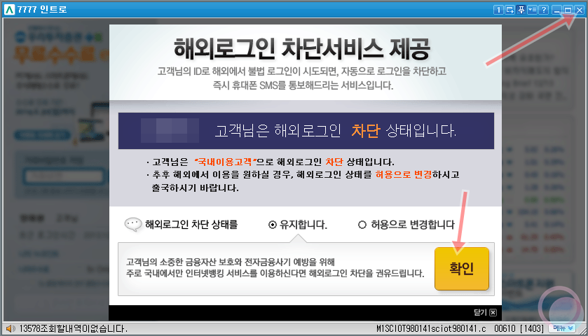 2) 다음 과정에서 이런 창이 나타나면 해외 로그인 차단 여부를 설정한 후 확인 및 종료 버튼을 눌러주면 됩니다.