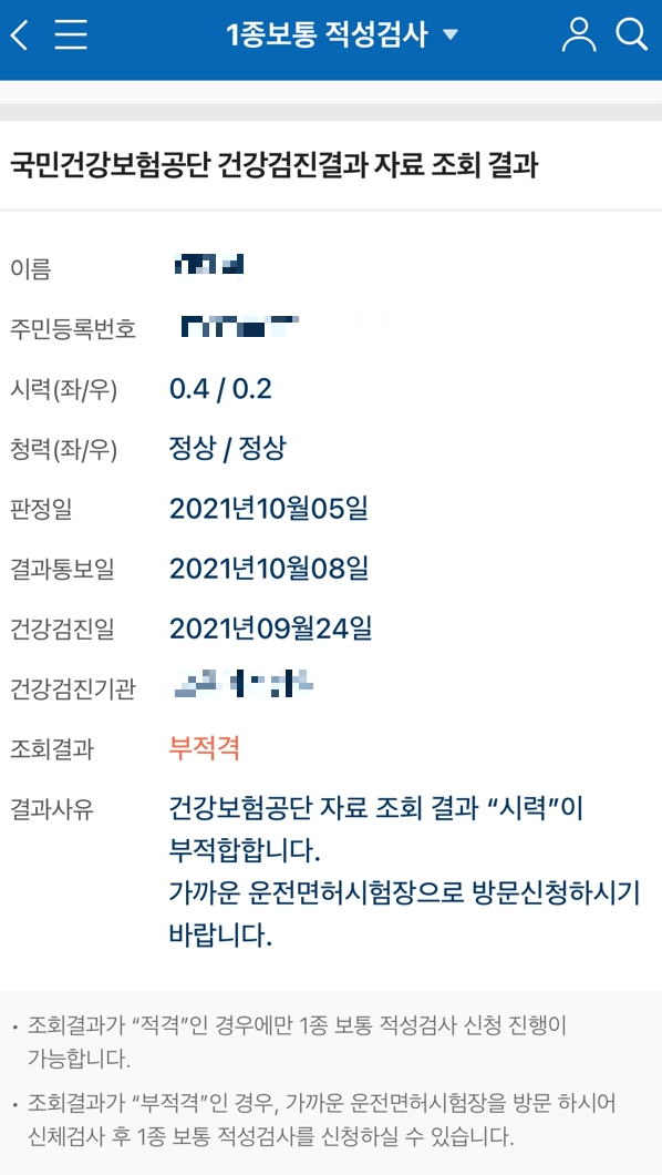 운전면허를 온라인으로 갱신하려고 보니, 시력 때문에 부적격 판정을 받아서 온라인 신청은 불가. 결국 두 발로 직접 뛰어다녀야 했다. 건강검진을 진행할 때 운전면허 적성검사 갱신을 고려해서 안경을 착용하고 시력검사를 받아야 했는데 아무 생각 없이 NO안경 상태로 검진을 받은 게 문제였다.