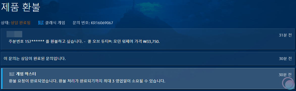 구매하고 24시간도 되지 않았는데 아무것도 할 수 없는 상황이 답답해서 그냥 될대로 되라는 식으로 블리자드측에 환불을 요청했습니다. 그런데 놀랍게도 늦은 시간이었음에도 불구하고 게임이 환불되더라구요?