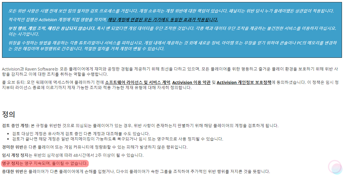 아니, 왜? 내가 뭘 했다고? 어제 게임을 구매하고 3~4시간 정도 게임을 하고 종료했을 뿐인데 도대체 뭐가 문제라서 영구정지 처분을..? 그리고 정지를 시킬꺼면 애초에 워존이나 약탈을 플레이 할 때 정지를 먹여야지, 왜 유료로 구매하고 나니까 바로 영정을 먹이는지 이해가 가질 않았습니다.