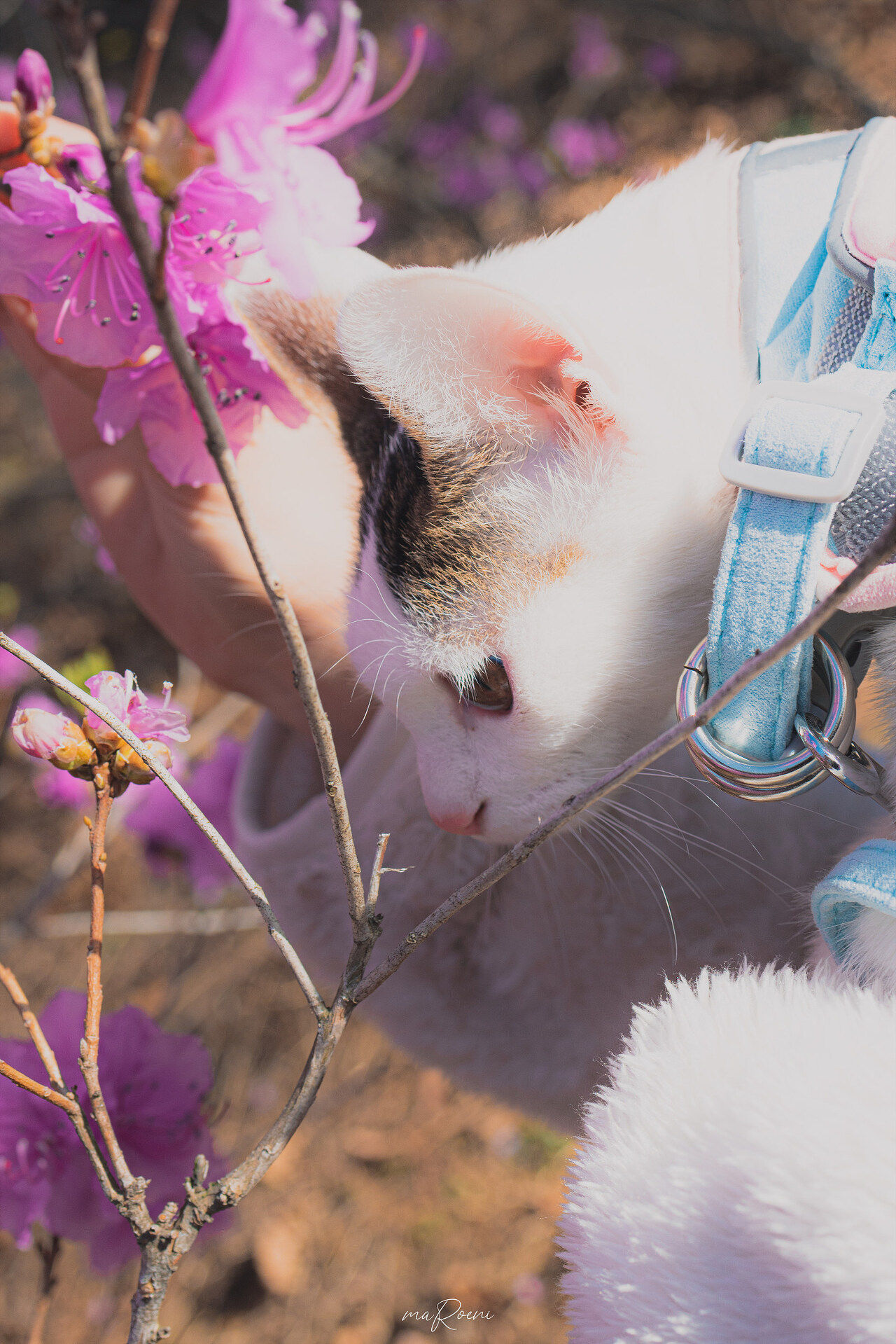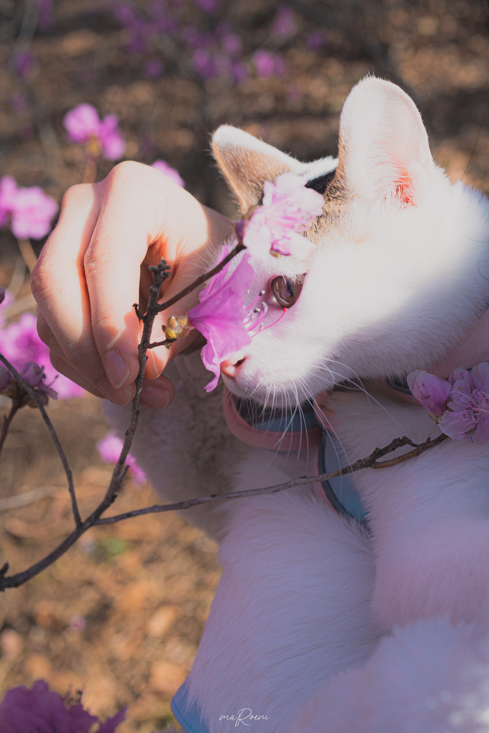 아무튼, 난생 처음 보는 진달래를 신나게 킁킁거리던 우리 집 냐옹양은 꽃이 신기한 건지, 꽃의 색이 신기한 건지.. 처음에는 격한 관심을 보였다가 수많은 관람객들을 보고 지레 겁을 먹고 숨어버리더라. 사진이라도 실컷 찍어둘걸..