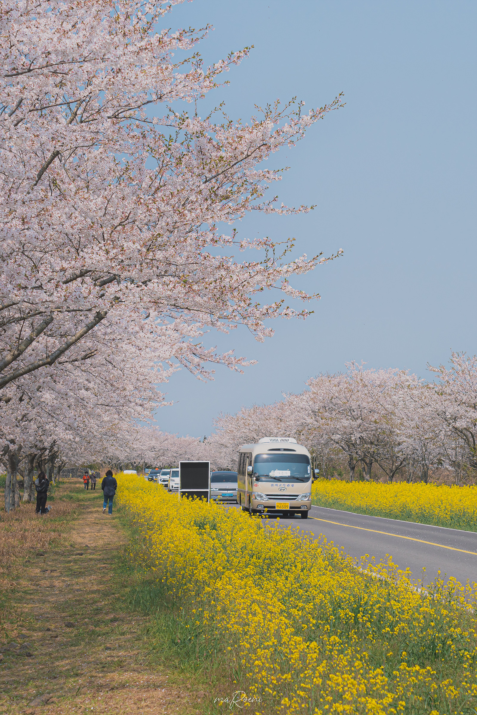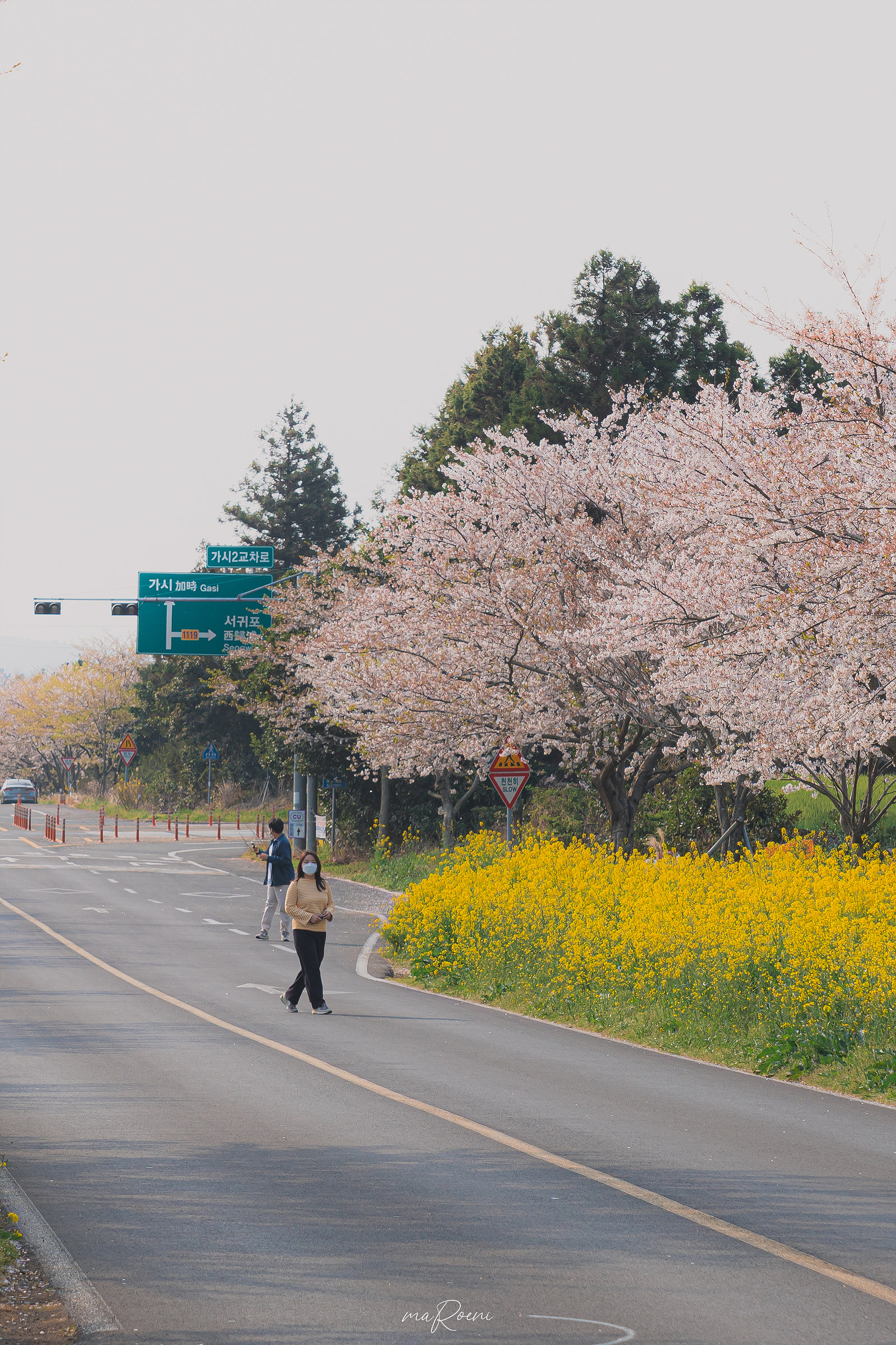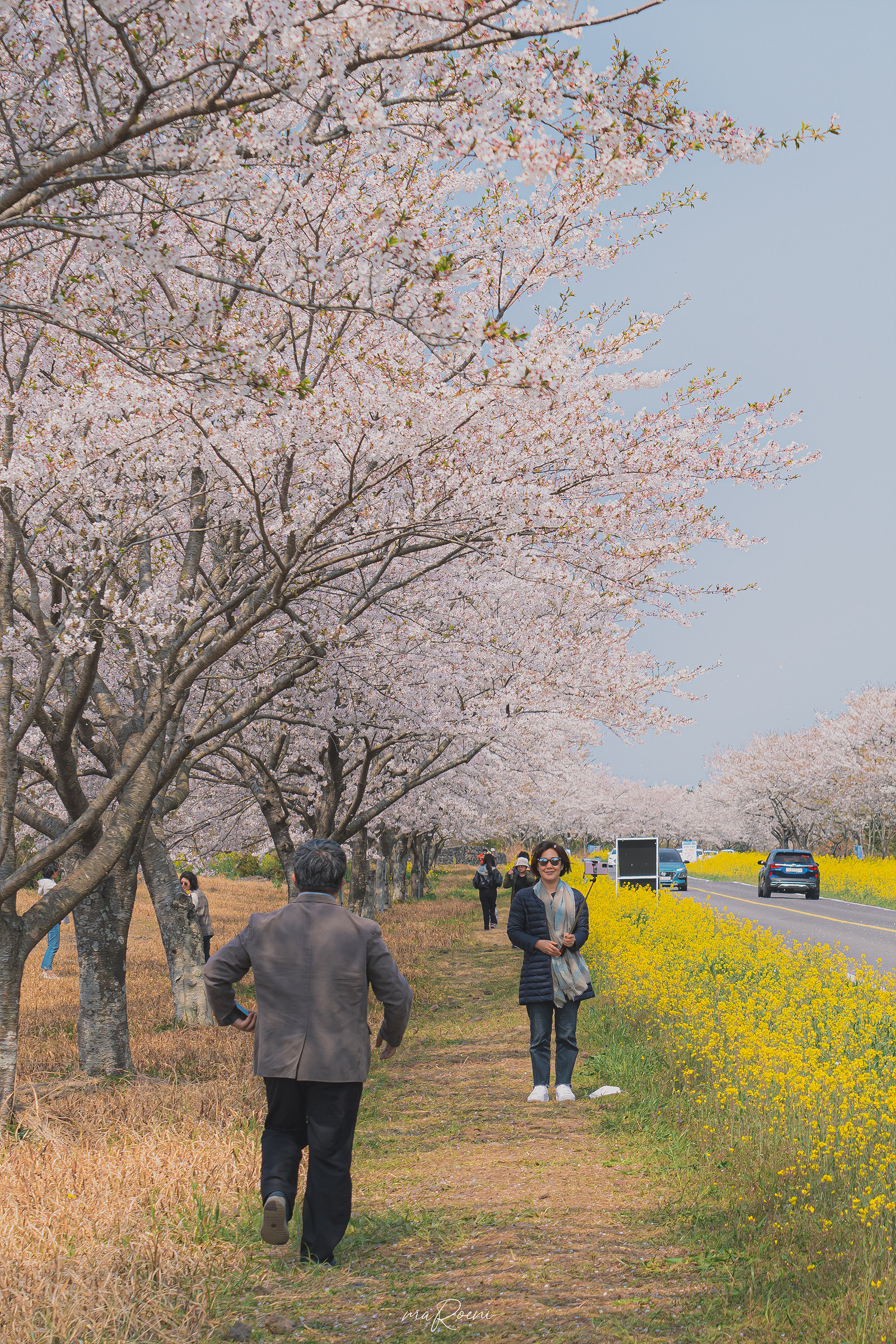 평소에는 오고 가는 차들이 별로 없는 한적한 도로에 불과하지만, 봄만 되면 유독 이곳을 찾는 관광객들로 인해 주차를 제대로 하기 힘들어질 지경에 이른다. 유채꽃만으로도 사람들의 시선을 사로잡기에 충분했을 텐데, 벚꽃까지 더해지니 갬성충들이 가만히 있을 수가 있을까?