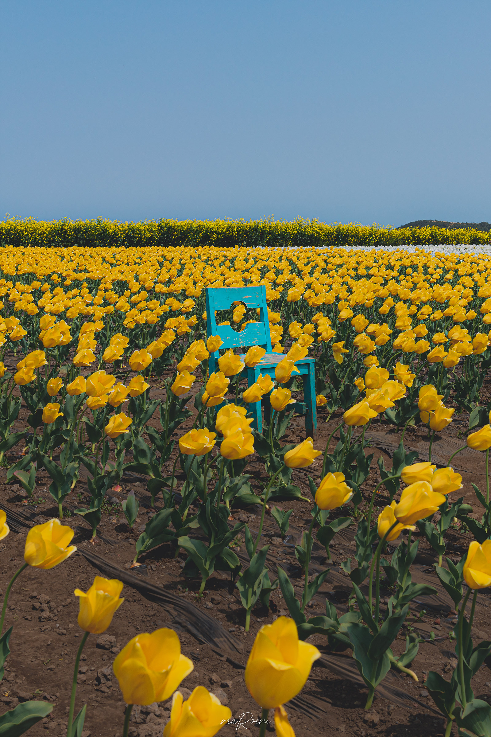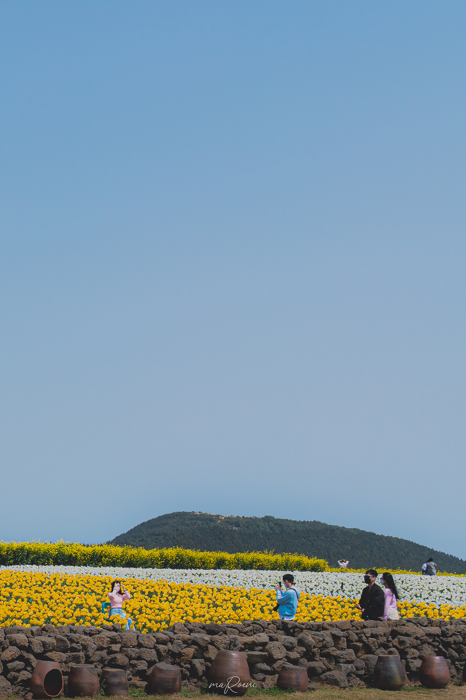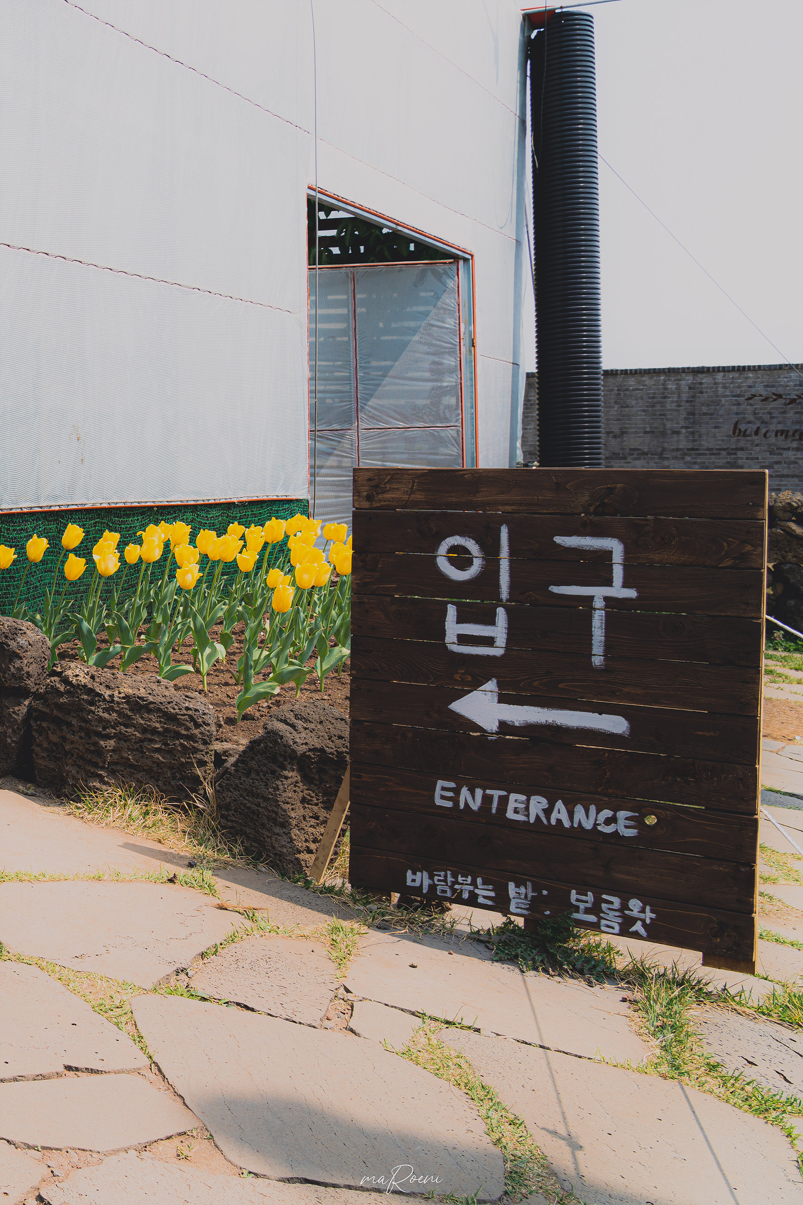 돌담아래에 감성 소품으로 진열된 항아리 쪽엔 보롬왓의 메인 포토 스팟인 의자가 하나 놓여져 있다. 다른 곳에서 사진을 찍어도 예쁘게 나오지만, 이곳에서 사진을 찍으면 튤립 뒤로 유채꽃과 제주의 푸르른 하늘을 함께 담을 수 있기에 제법 인기가 많은 모양이었다. 그리고 이 길 끝에 청보리가 있다고 하던데, 그 꽃이 다 그 꽃 같아서 찾을 수가 없겠더라.