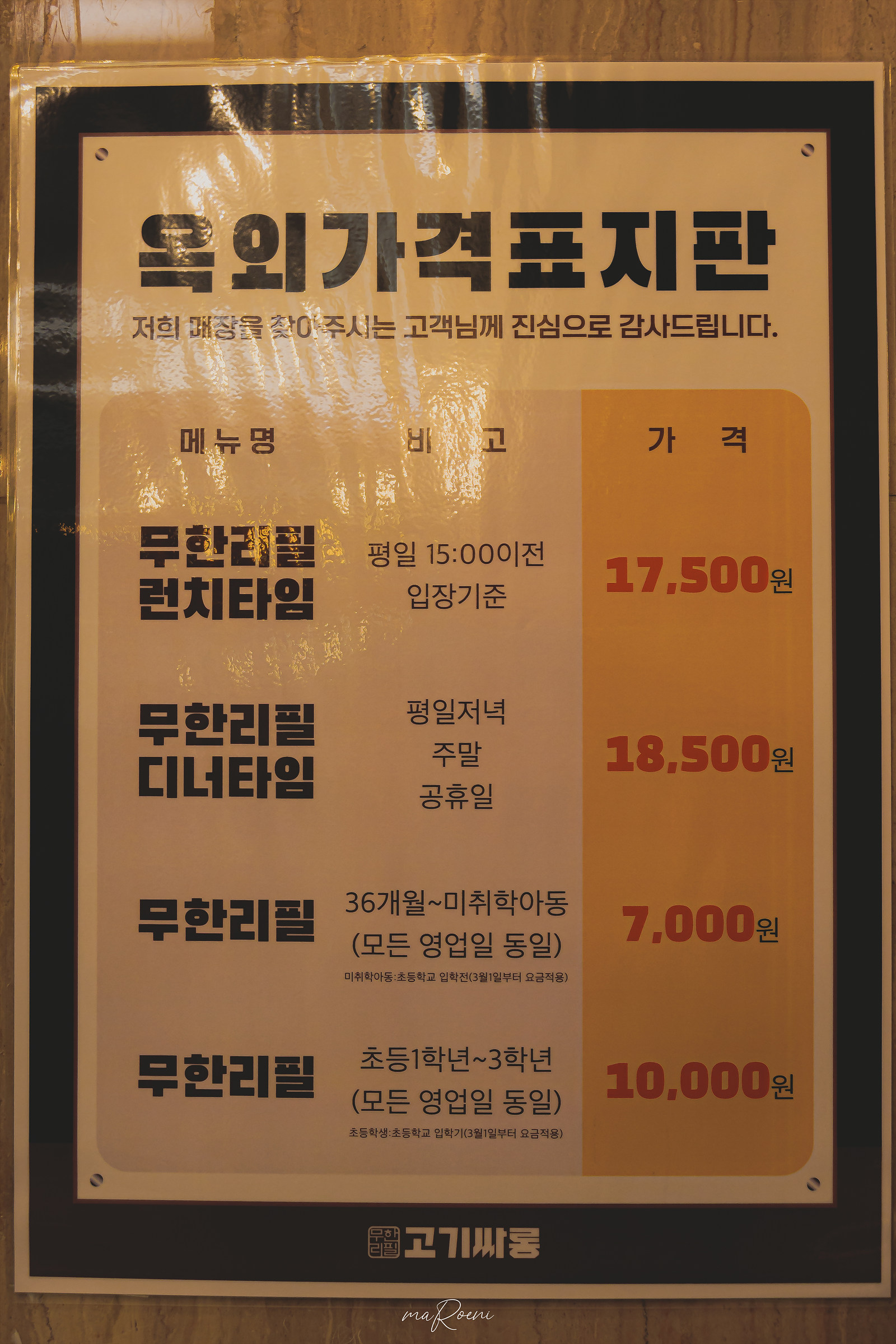 무한리필 고기싸롱의 가격표. 요즘 물가를 생각해봤을때, 나름 저렴한 것 같은 느낌이 든다.