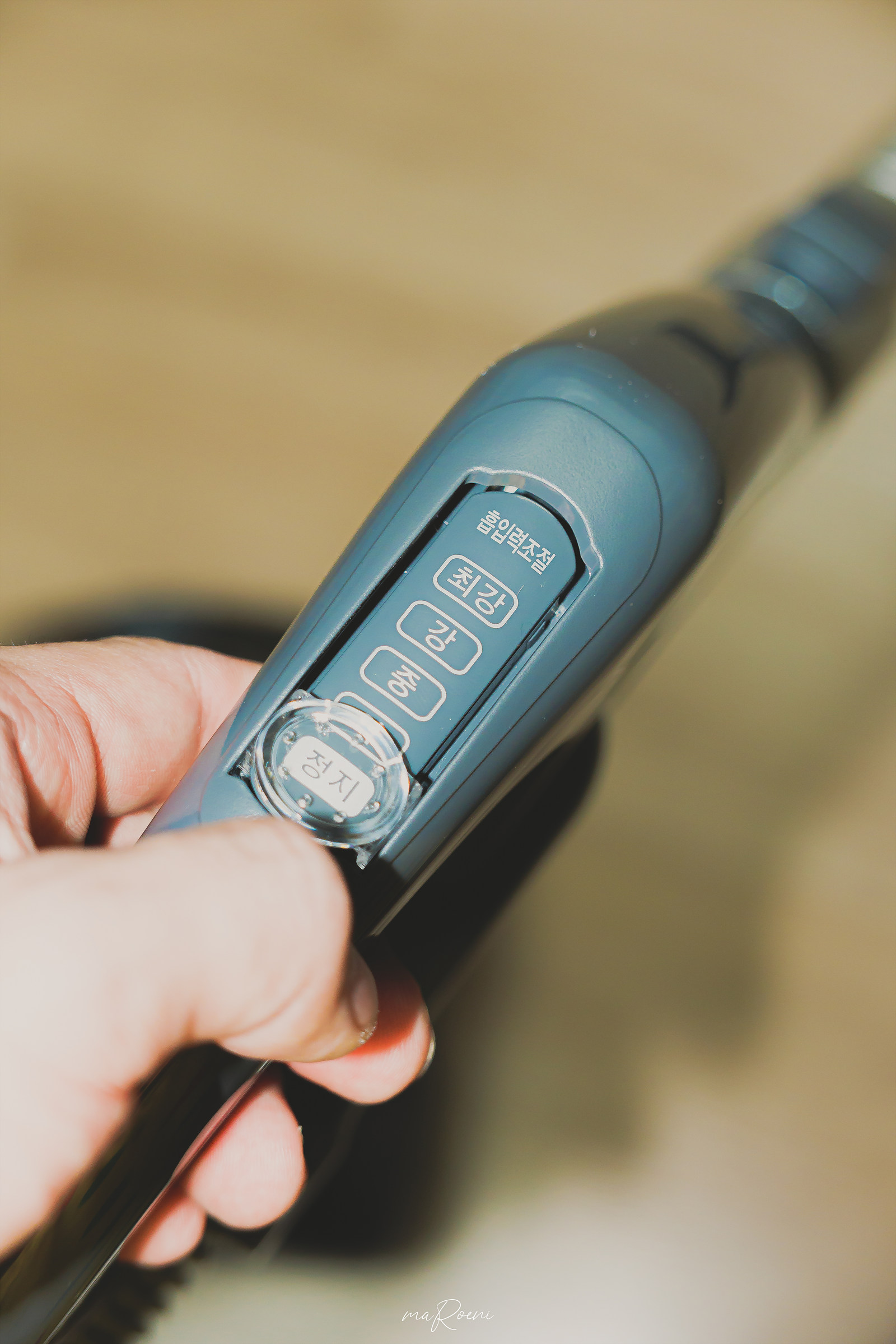 약, 중, 강, 최강으로 흡입력을 조절할 수 있다. 고정타입이 아닌 슬라이드 타입이라 파워 조절이 조금 애매하지만 적응하면 문제가 될 것 같아 보이지는 않았다. 파워별로 소음도 다른데, 우리 집에서 강~최강은 너무 소음이 크기 때문에 중정도 놓고 사용하는 게 적절했던 것 같다.