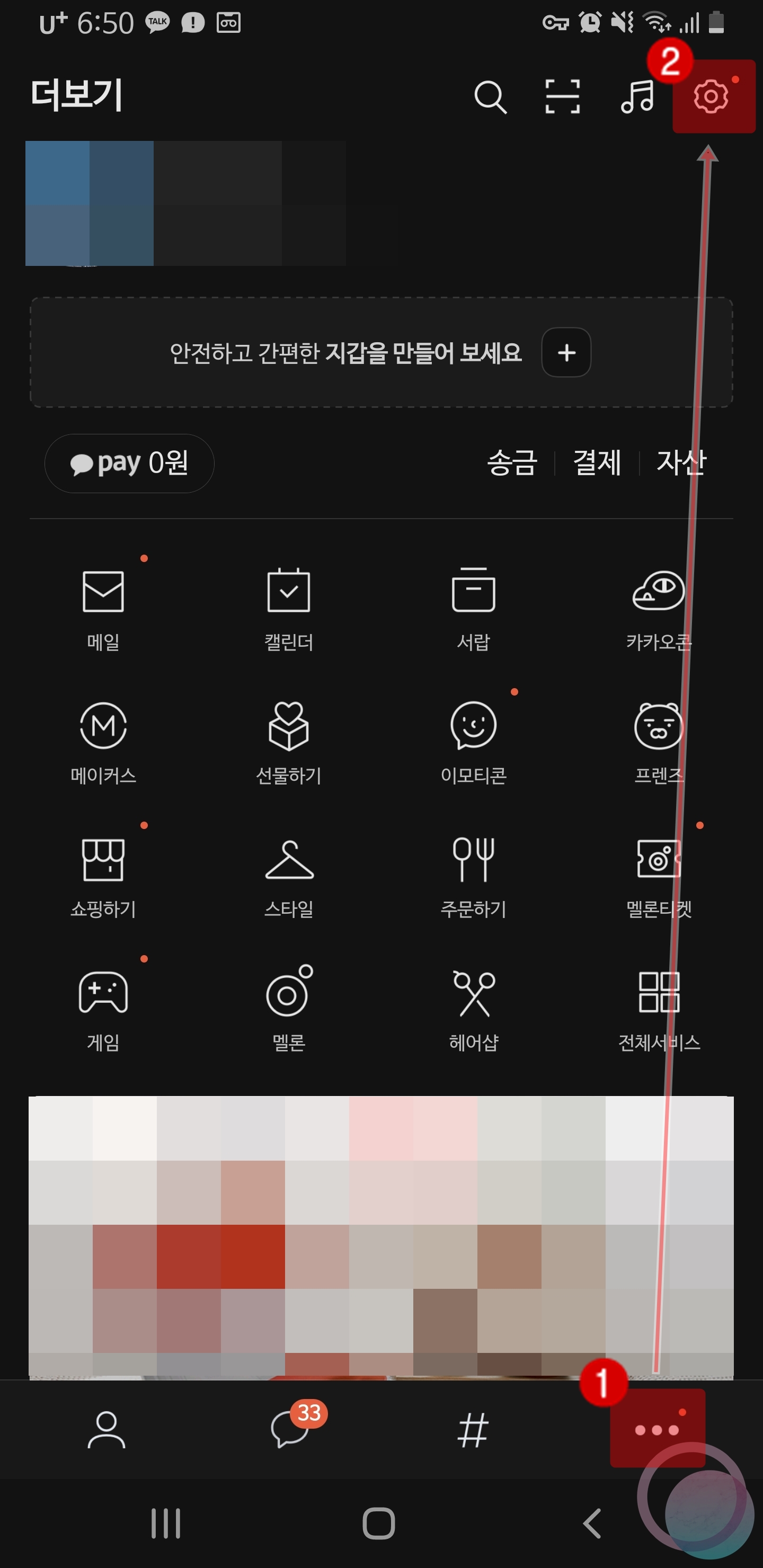 카카오톡에서 메뉴를 누른 후 오른쪽 상단의 톱니바퀴 모양의 설정 버튼을 눌러줍니다. 이후 설정창이 나타나면 채팅을 선택해줍니다.