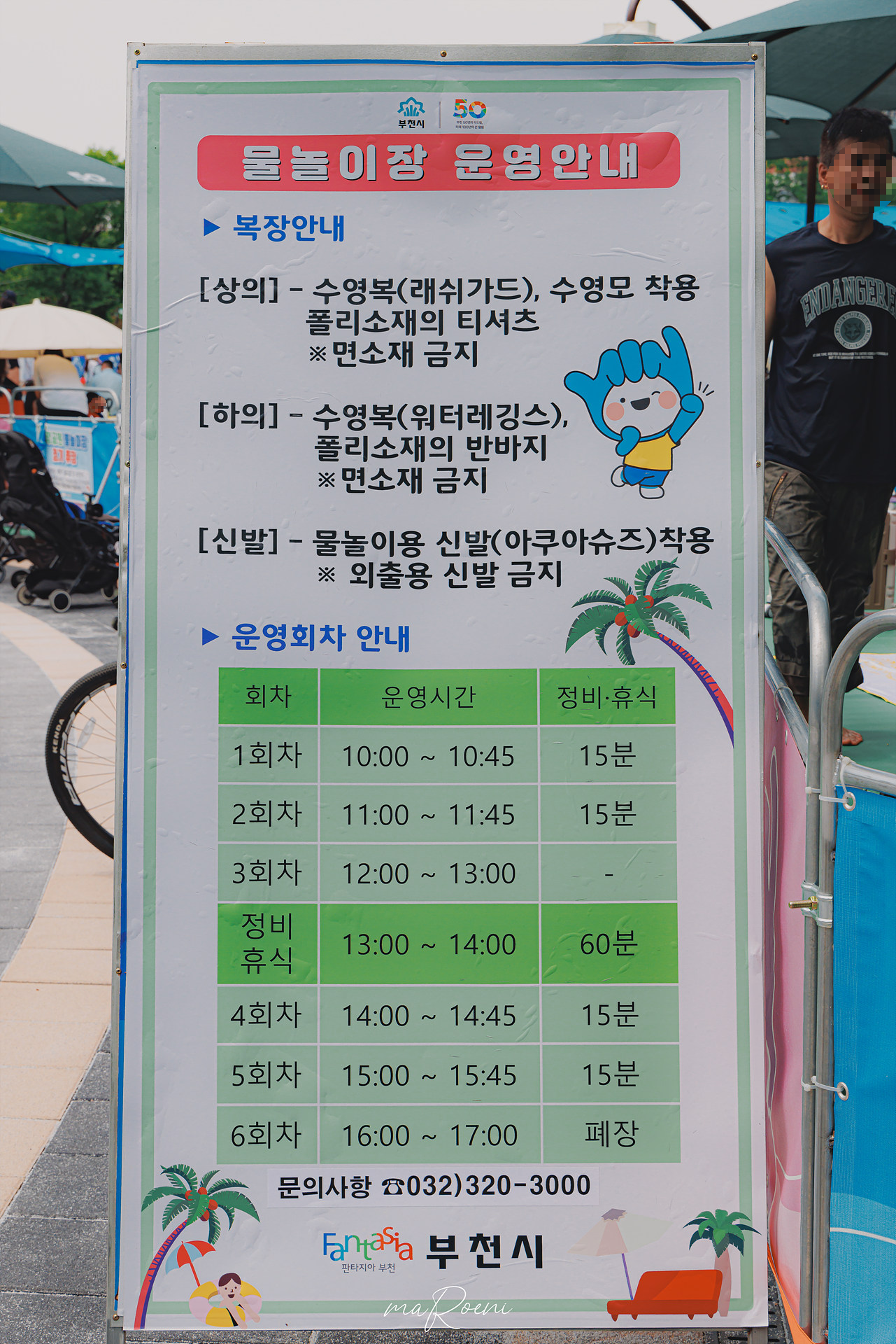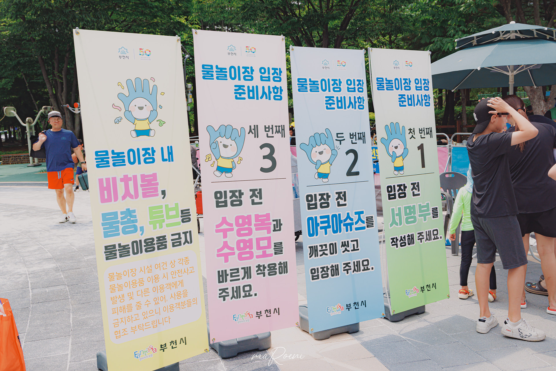 부천 물놀이 입장료는 무료다. 부천시민에게만 해당되는 내용이겠거니 싶었는데, 관계자분께서 그냥 무료라고 한다. 입장할 땐 서명부를 작성한 후 아쿠아슈즈를 착용한 후(맨발 가능) 수영복과 수영모를 착용하며 비치볼과 물총, 튜브를 사용하지 말라는 경고문구가 붙어있다. 현장을 보니 이 안내문을 완벽하게 지키는 사람들은 없는 것 같지만 말이다.