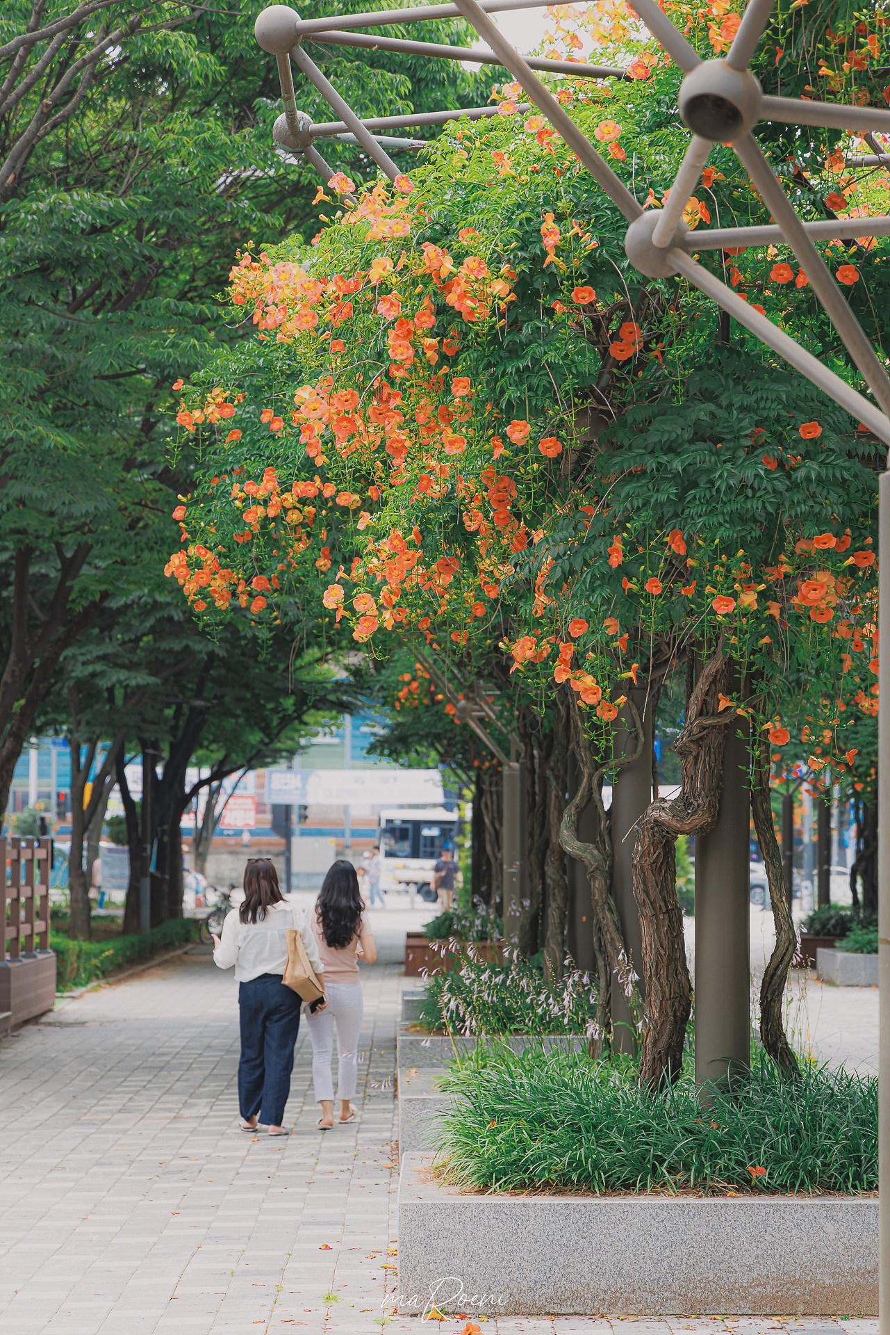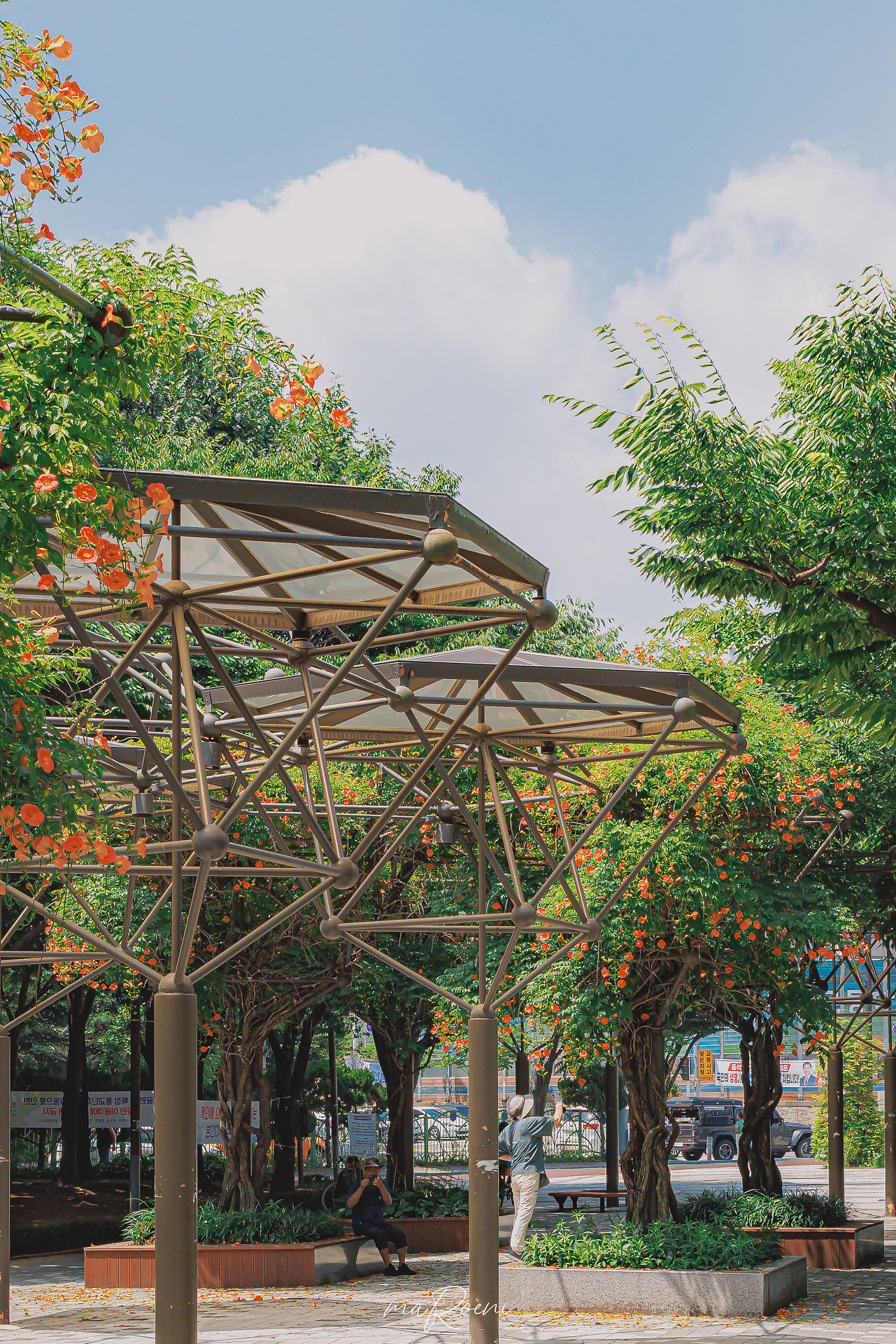 소문 듣고 멀리서 찾아오신 분들인지, "생각보다 능소화가 많이 없네~" 라고 말씀하시는 소리를 들었다. 확실히 그 말은 맞다. 여기 네이버 카페 링크를 타고 들어가 보면 천장에서부터 바닥까지 주렁주렁 피어난 리얼 100% 능소화터널을 볼 수 있는데, 현재는... 부천시에서 가지치기를 제대로 해버려서 이전의 모습은 사라지고 60% 정도만 남아있다.