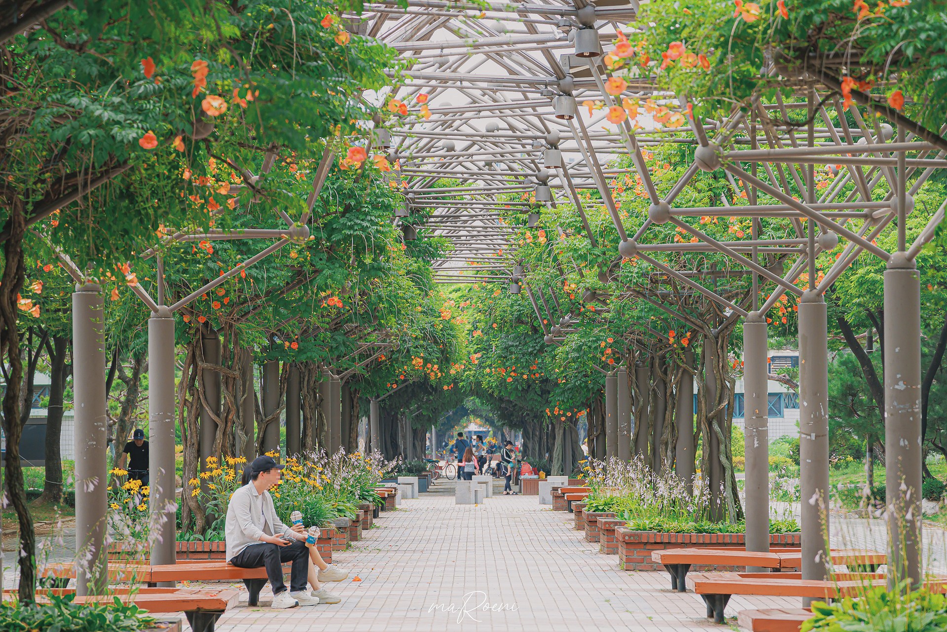 중앙공원 능소화터널의 단점은 능소화가 사람 손이 닿지 않는 기둥 위로만 피어있어서 뚝섬 능소화 명소처럼 능소화를 바로 옆에 끼고 사진을 찍을 수 없다는 것이다. 꽃을 바로 옆에 두고 사진을 찍으려면 사람들이 앉아서 휴식을 취하는 의자를 밟고 올라가야 하기 때문이다.