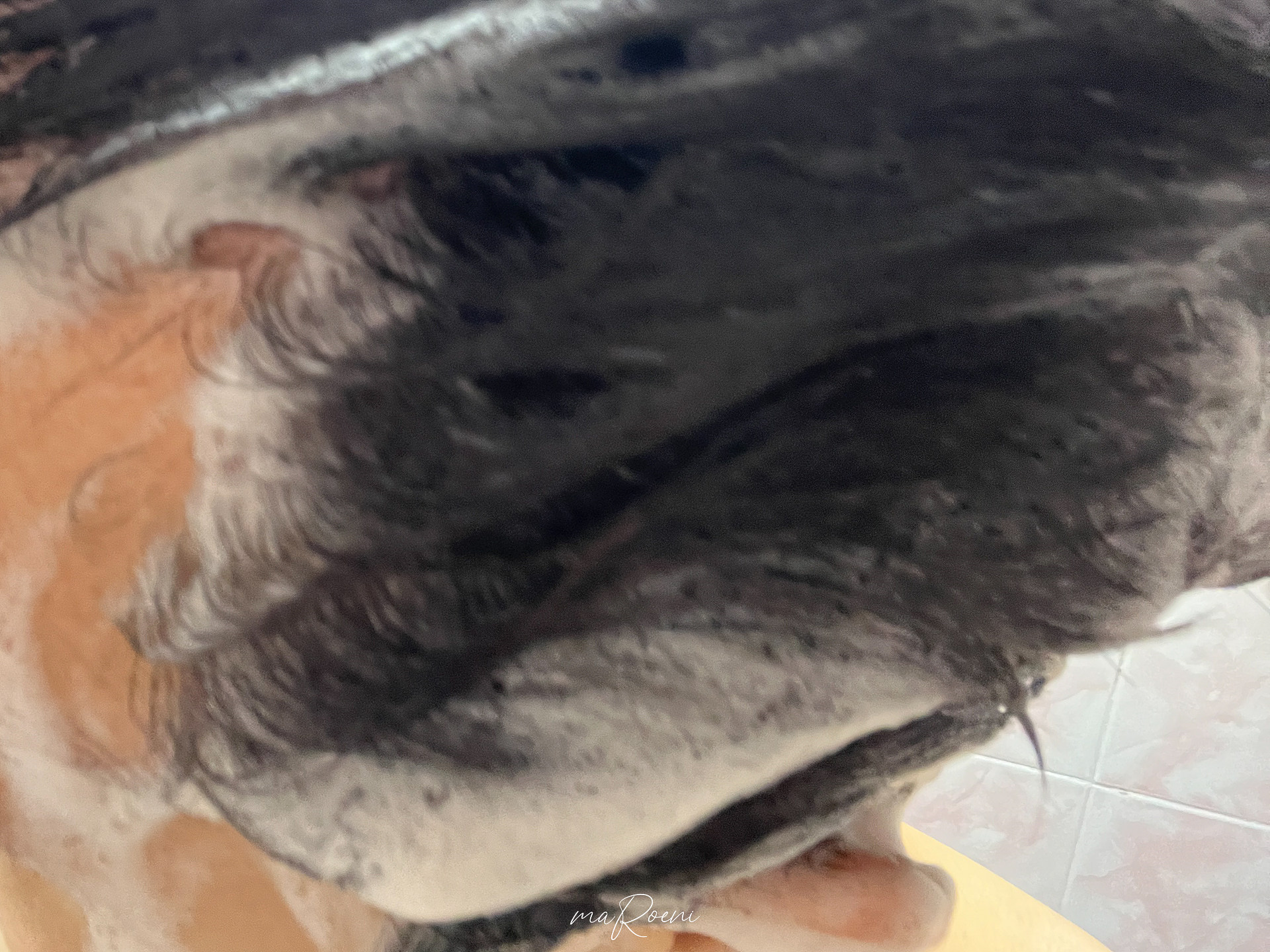 설명서엔 샴푸를 한 후 일정 시간이 지나고 헹구라고 되어있는데, 나는 머리를 감을 땐 늘 샤워를 하기 때문에 꾸띄르 염색샴푸로 먼저 머리를 감고 몸에 비누칠을 한 후 세수까지 하여 온몸의 거품을 한꺼번에 씻어내리는 루틴을 사용했다. 이렇게 하면 머리에 거품이 약 10~15분 묻어있는 셈.