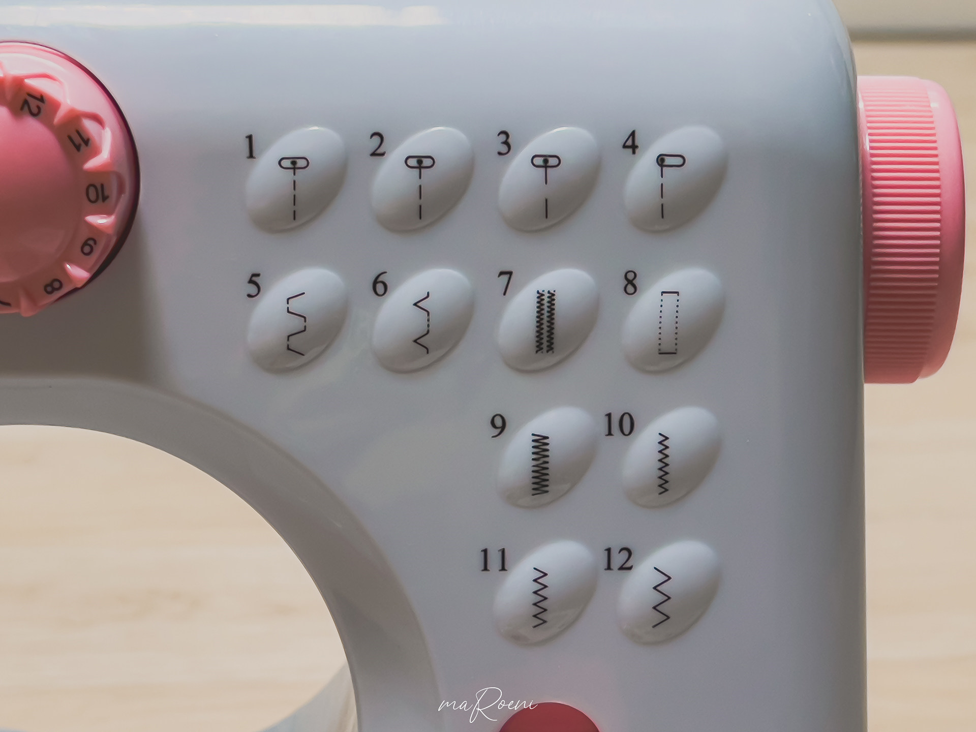 조작레버가 복잡해 보이지만, 알고 보면 간단하다. 우측에는 12가지의 박음질 방법을 설정할 수 있고 중앙부에는 실의 장력을 조절할 수 있다.