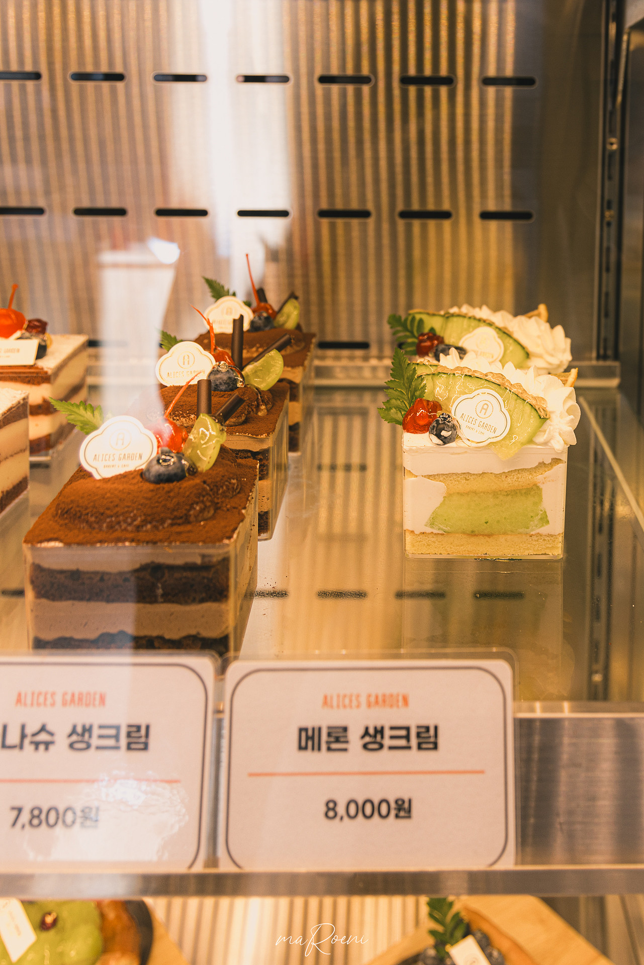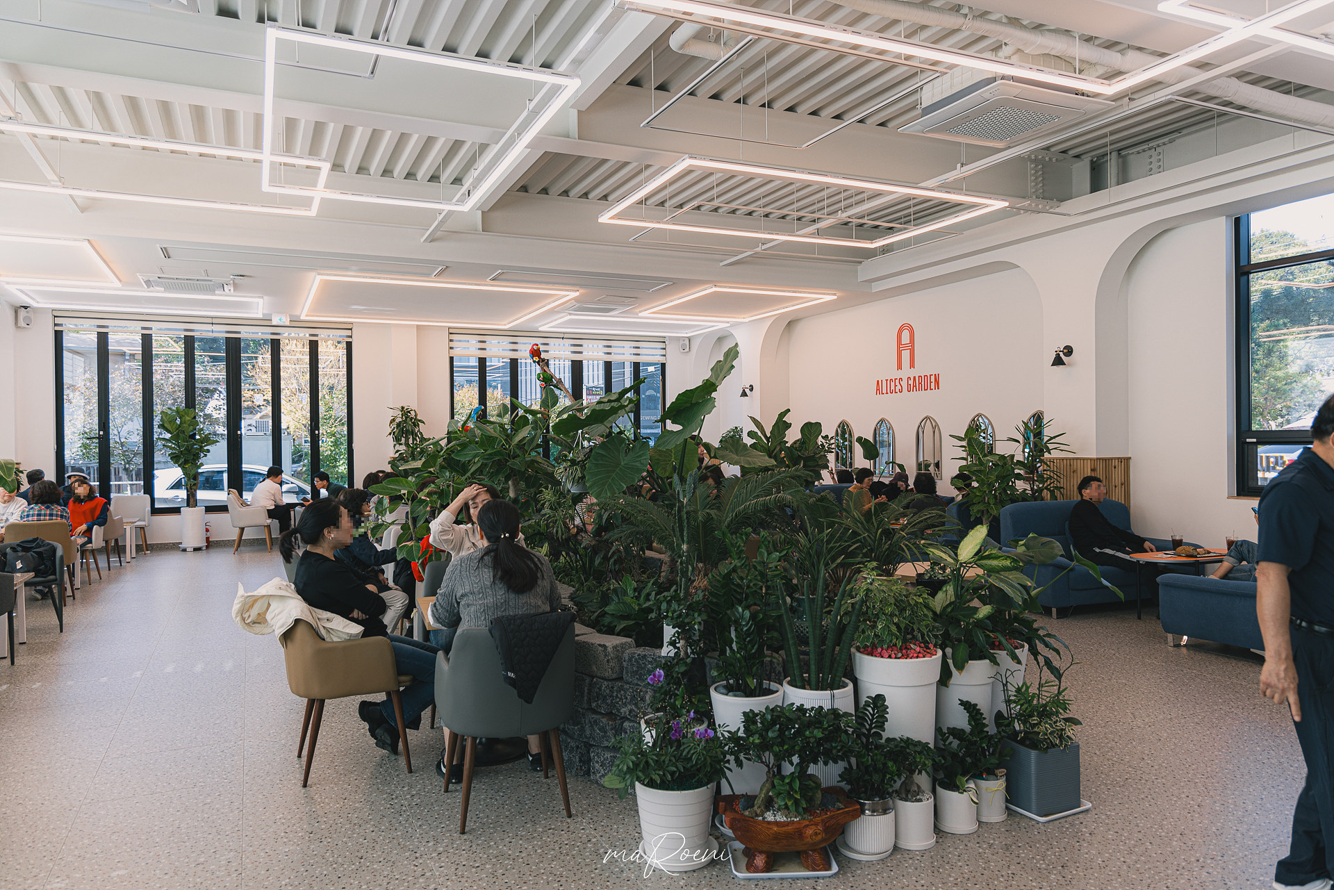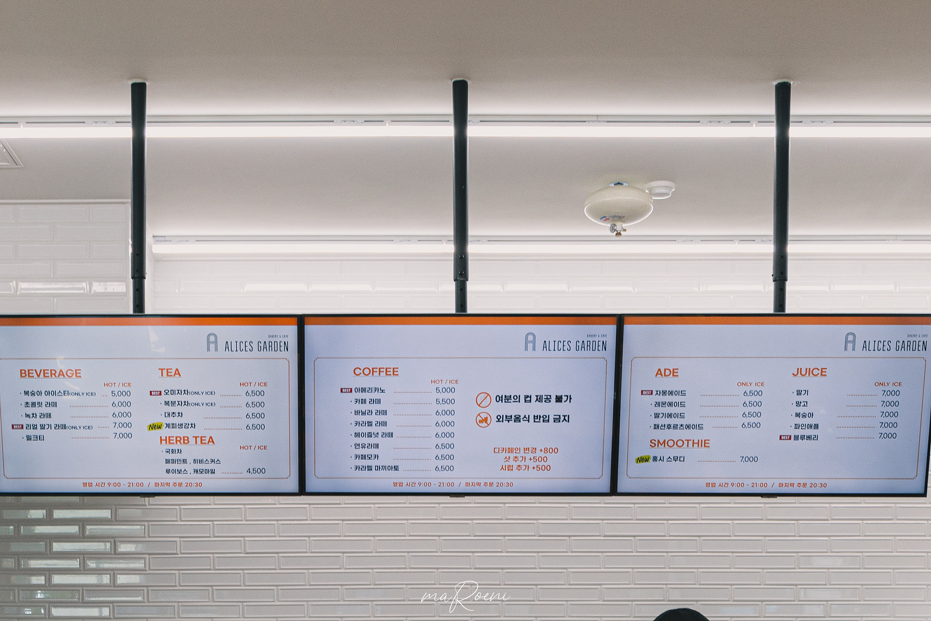 그나마 야외 쪽은 사람들의 북적임이 백색소음처럼 자연스럽게 들려서 좋았었다. 앨리스가든을 찾아오신다면 실내보다는 실외를 이용하시길 적극 권장함. 실내는 옆사람하고 테이블이 너무 붙어있어서 프라이빗한 이야기를 나눌 수가 없을 정도임.