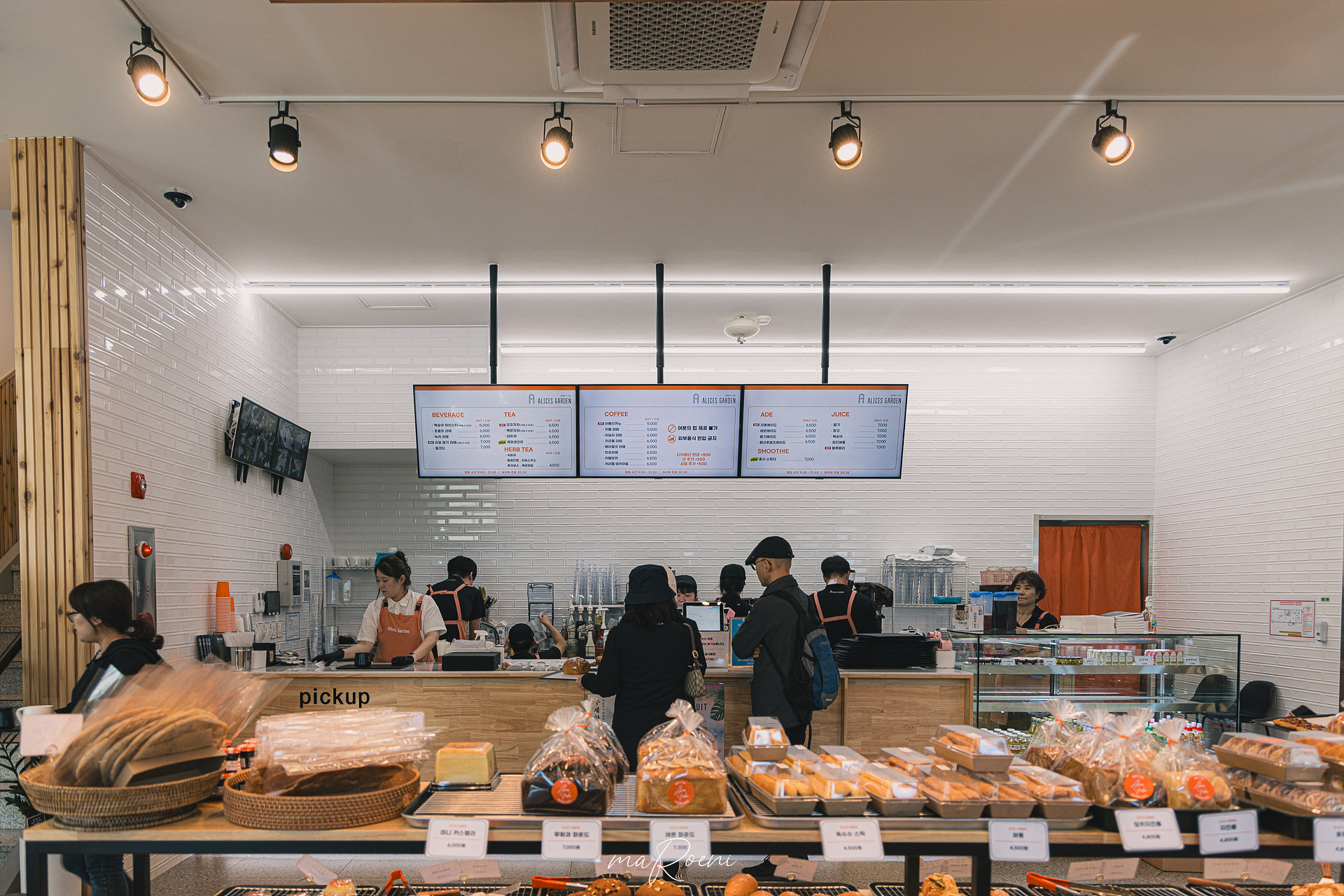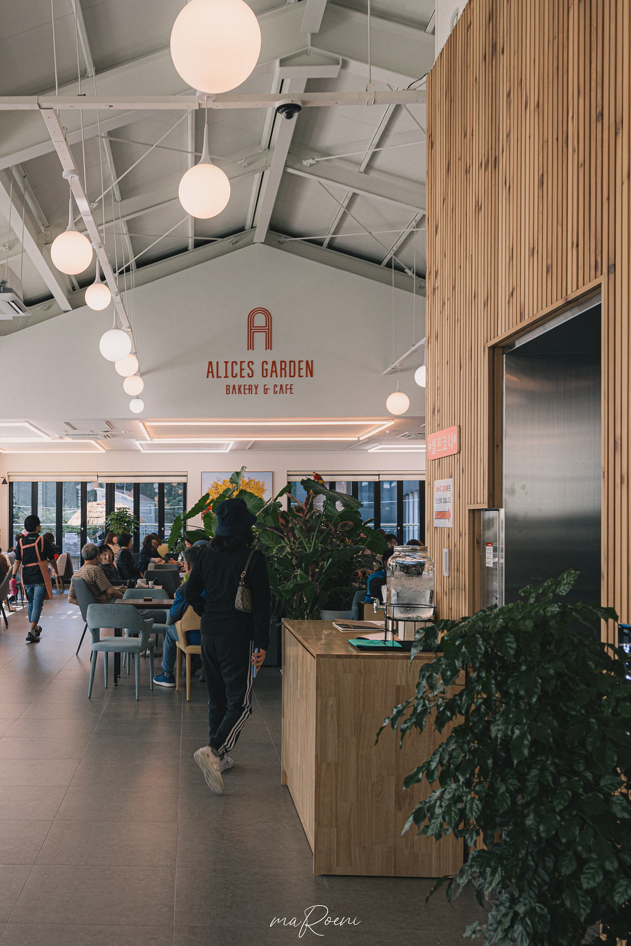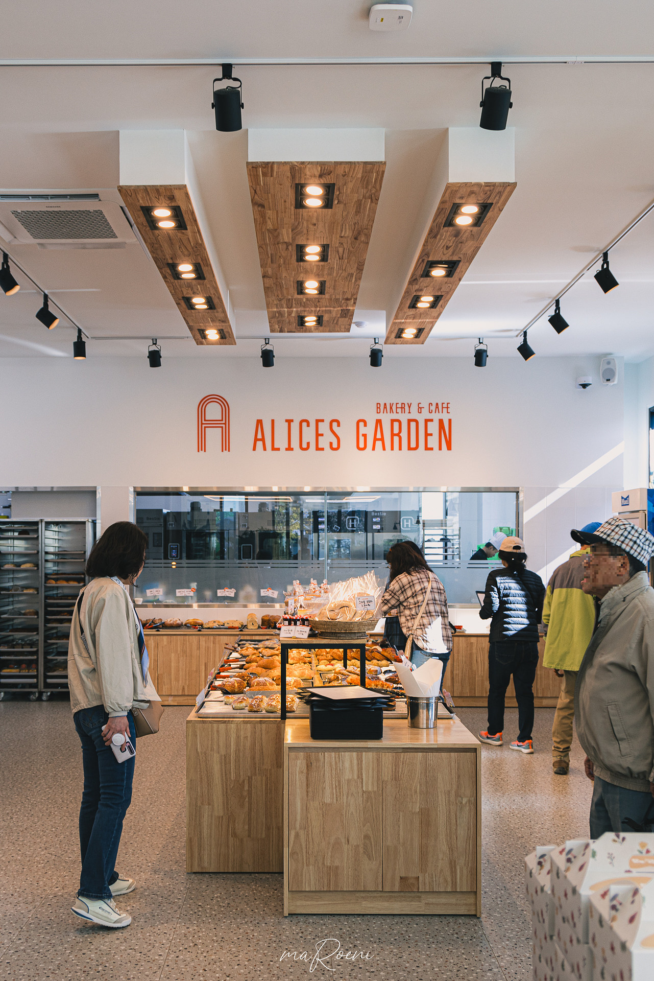 인천대공원 카페 앨리스가든은 입구를 기준으로 왼편으로는 테이블이, 오른편에는 빵들이 진열되어 있고 안쪽 창문 너머로는 실제로 빵을 만들고 계시는 제빵사 분들의 모습을 실시간으로 감상하는 것이 가능하다. 사진을 찍고 싶었지만 뭐랄까.. 비법소스를 훔쳐가는 그런 느낌적인 느낌이었어가지고 먼발치에서 사진만 남겨봤다.