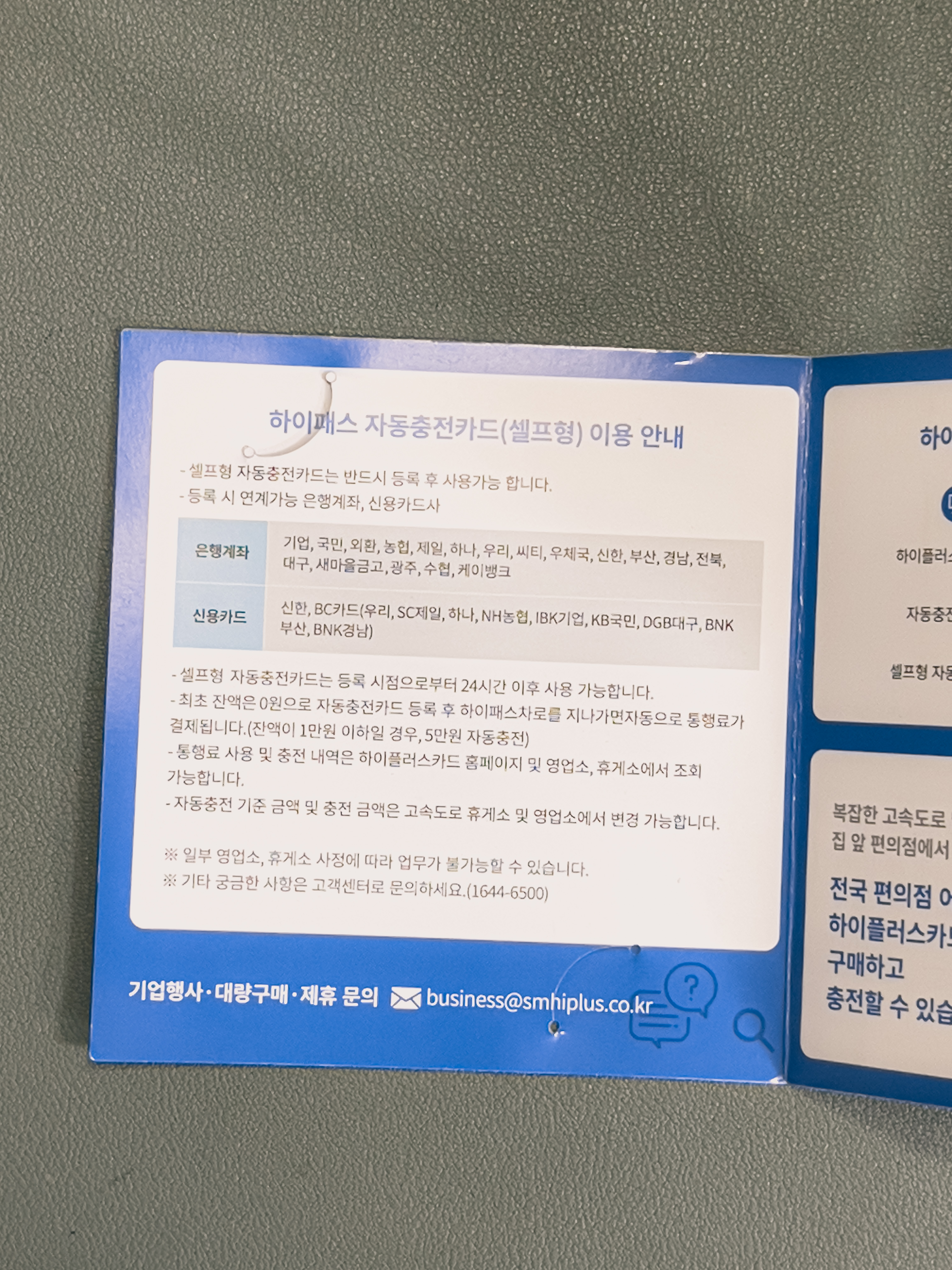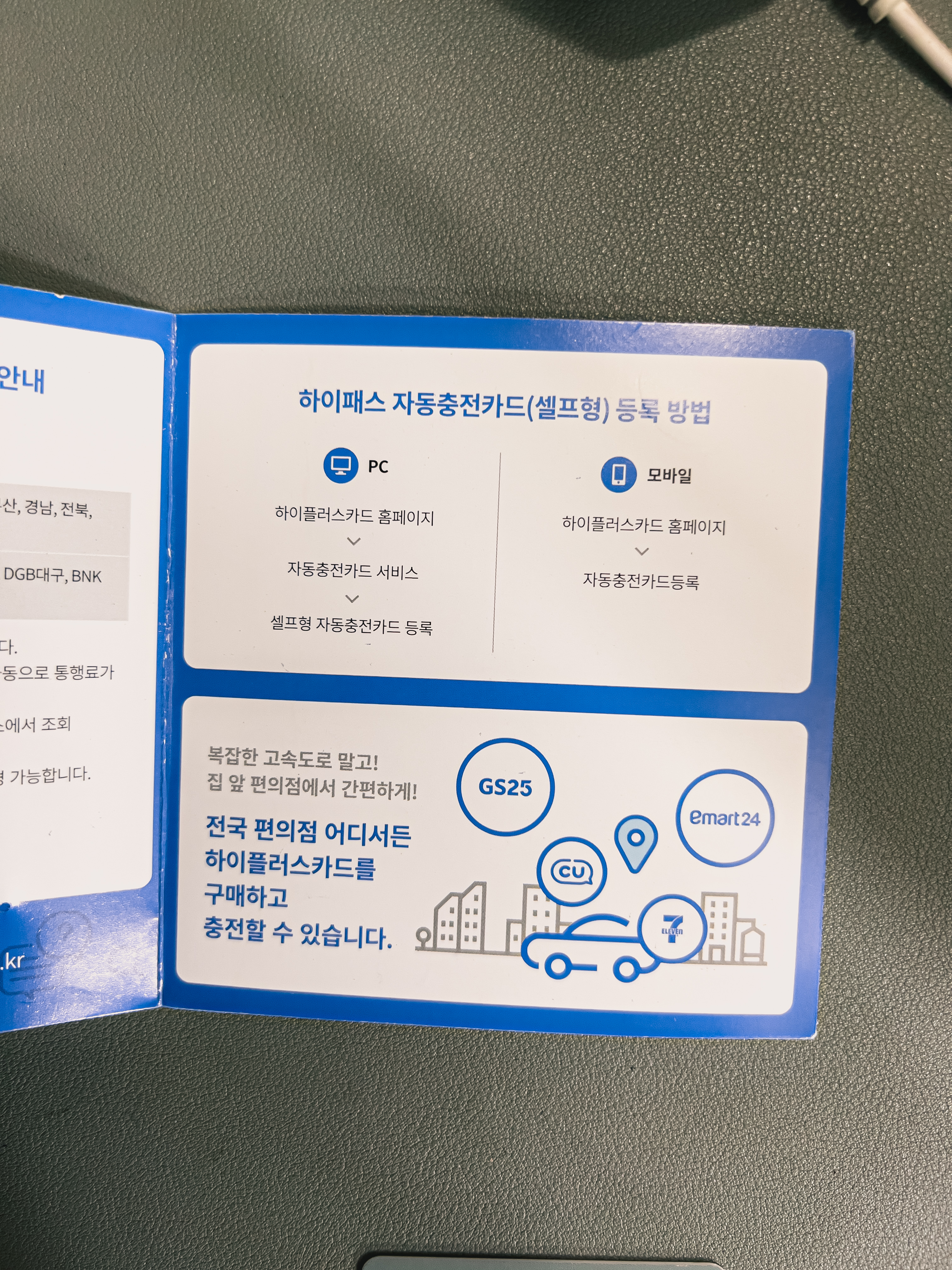 지난주에 고속도로를 타고 톨게이트를 지나다가 깜짝 놀랄만한 일이 벌어졌었다. 하이패스 카드를 장착하지도 않은 채 당당히 하이패스 톨게이트를 지났기 때문이다. 초보운전자인 내가 쏘카나 그린카 같은 카쉐어링을 이용했었을 땐 하이패스가 기본적으로 장착되어 있었기에.. 별생각 없이 고속도로를 이용했었는데, 자차를 운행할 때 하이패스 카드가 따로 필요한 줄은 몰랐었다.