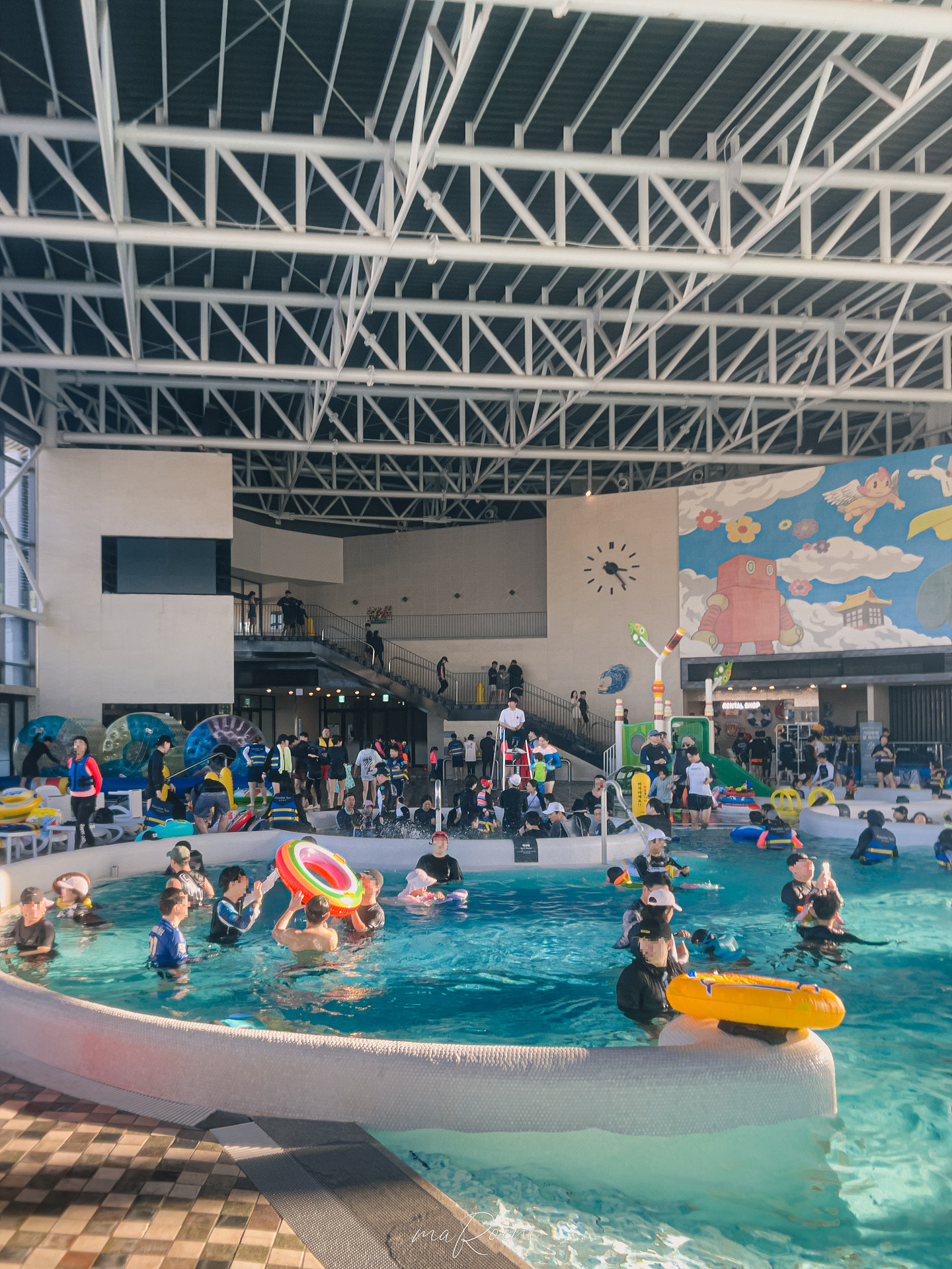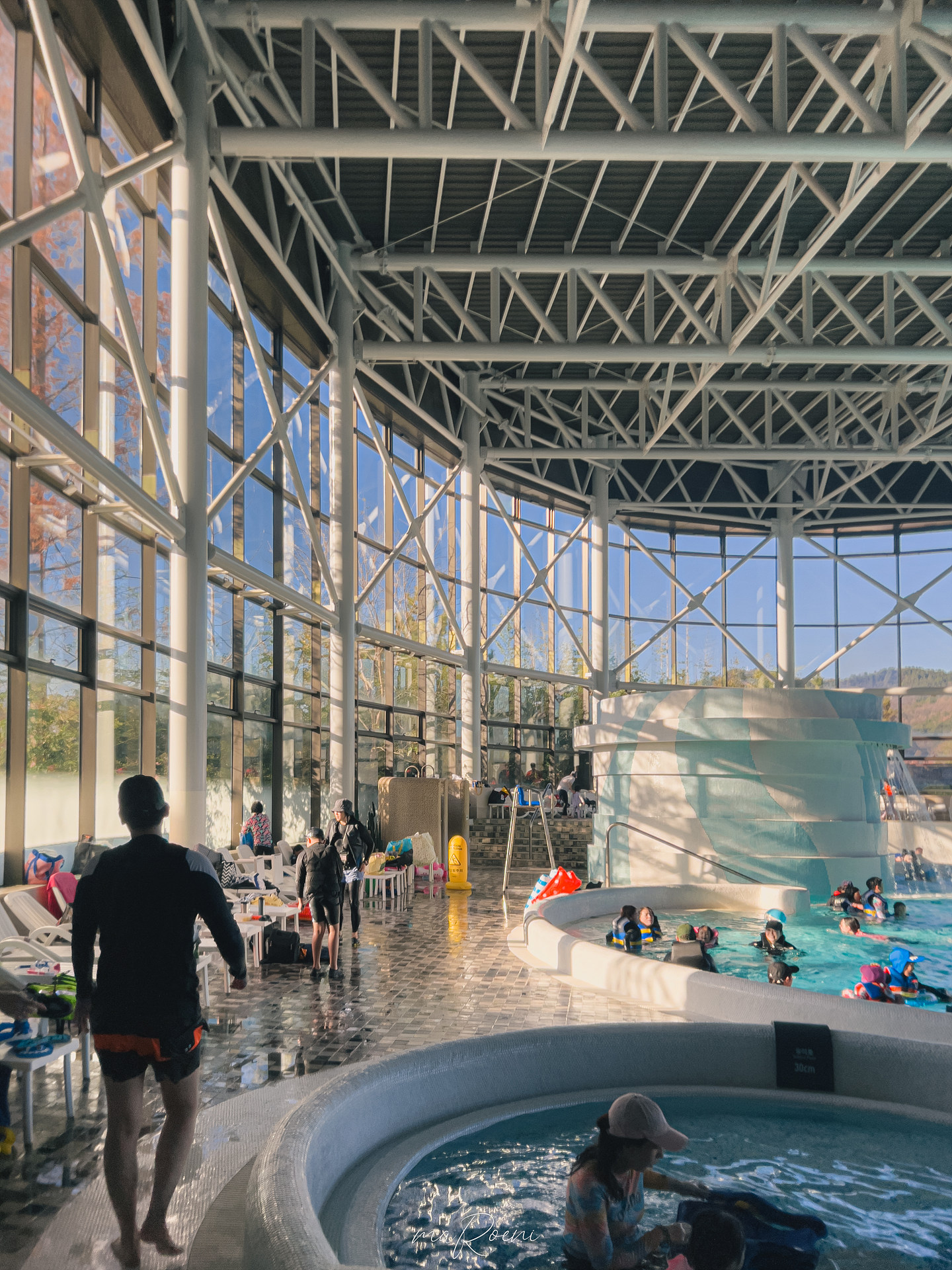 외부 날씨가 추웠던 탓에 실내수영장에는 사람들이 바글바글했음. 튜브에 바람을 넣고 빼는 곳이 있으며 구명조끼나 튜브 같은 걸 대여할 수 있는 렌탈샵이 있다. 가격은 관광지답게 창렬인 상태지만 구명조끼가 없으면 파도풀을 이용할 수 없기 때문에 5,000원을 내고 구명조끼를 대여했음.