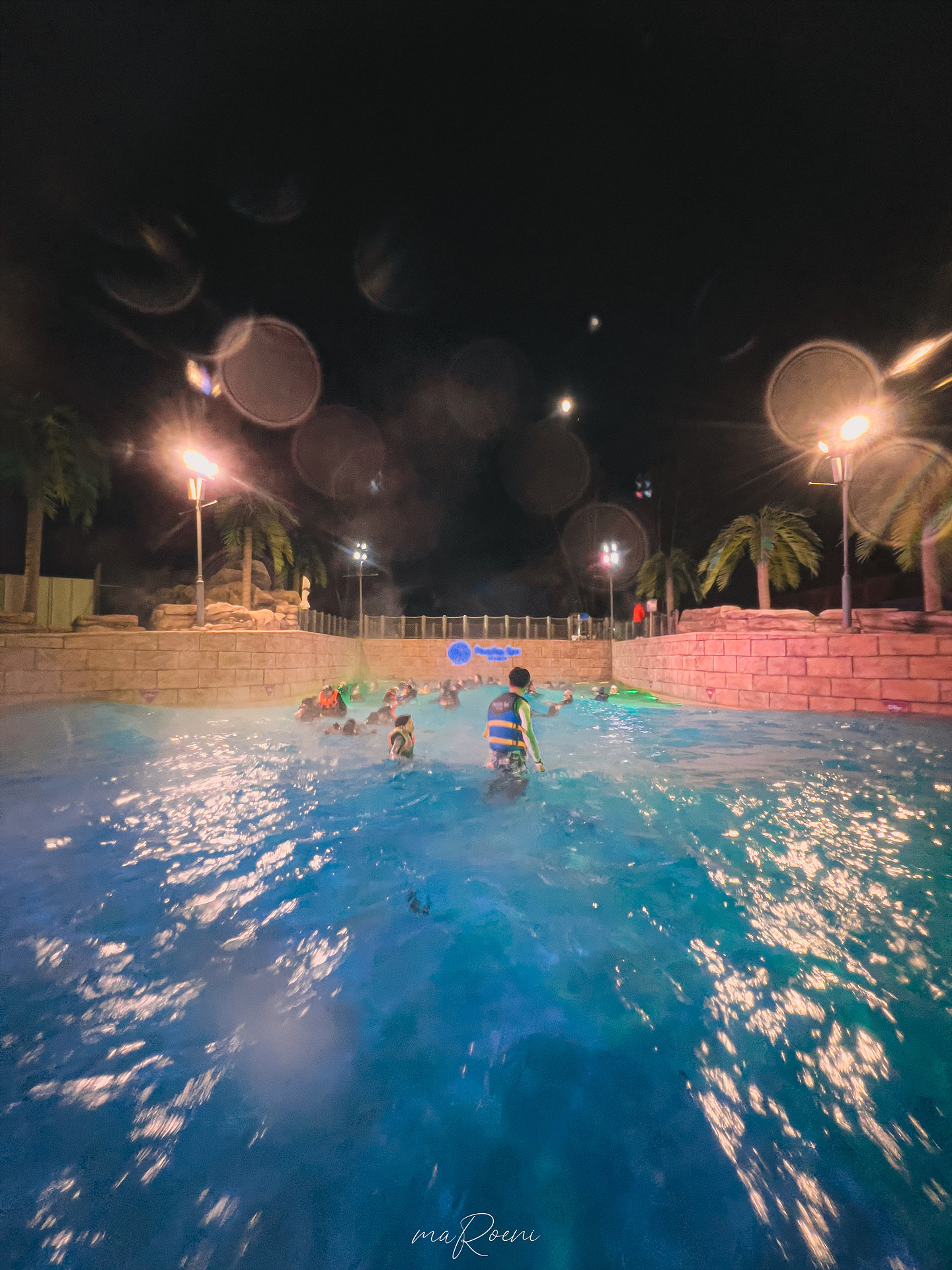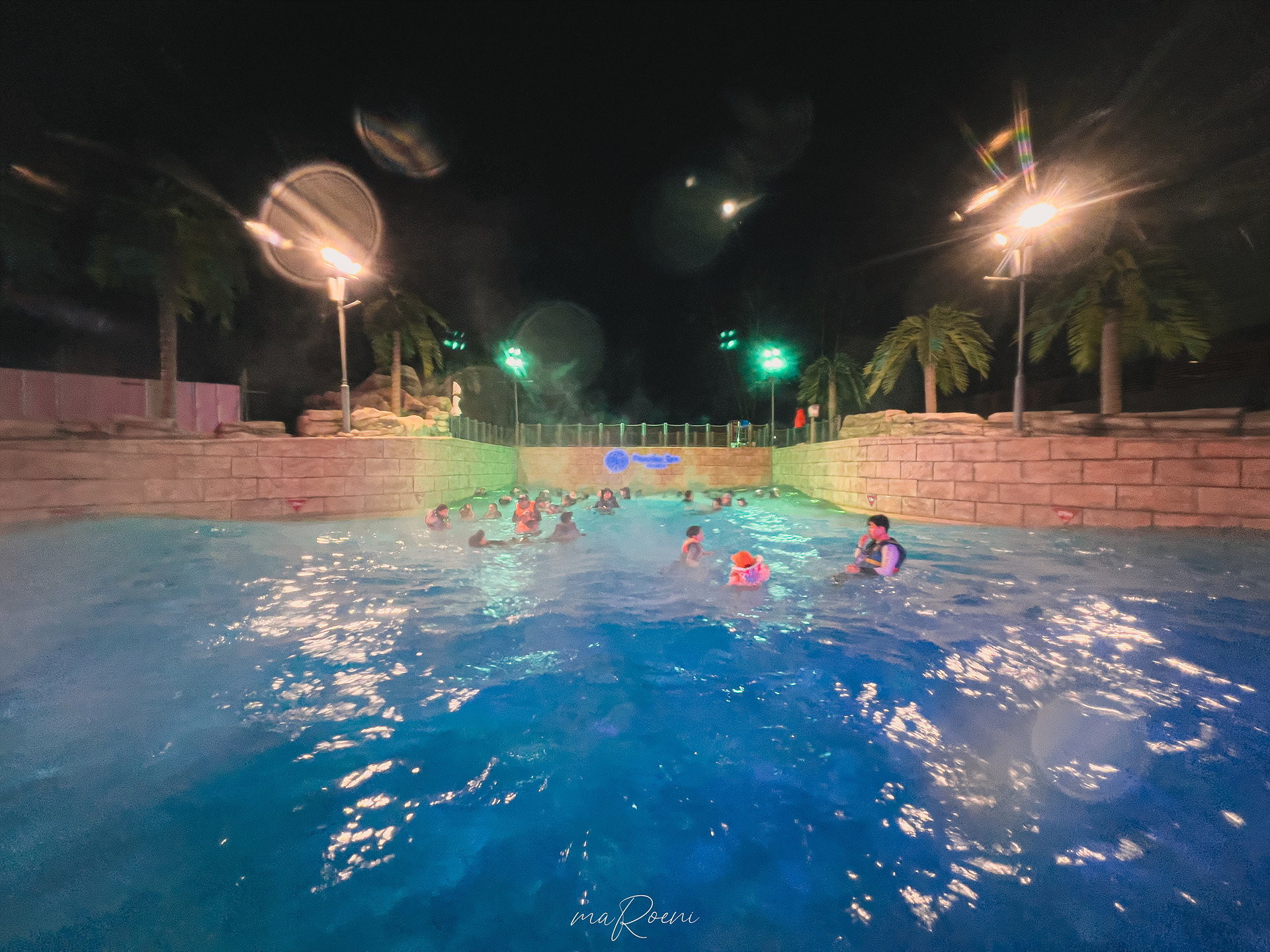 파라다이스 도고 나이트스파로 오신 분들이 늦게까지 물놀이를 즐기시는 중. 사람들이 많이 빠지긴 했지만 그래도 많았음.