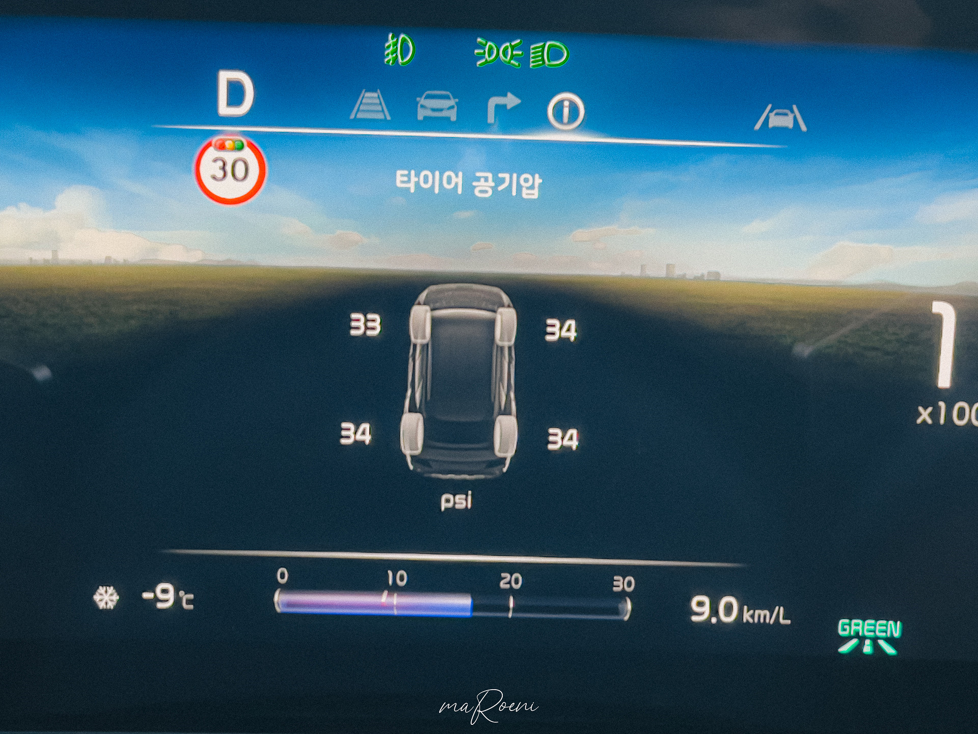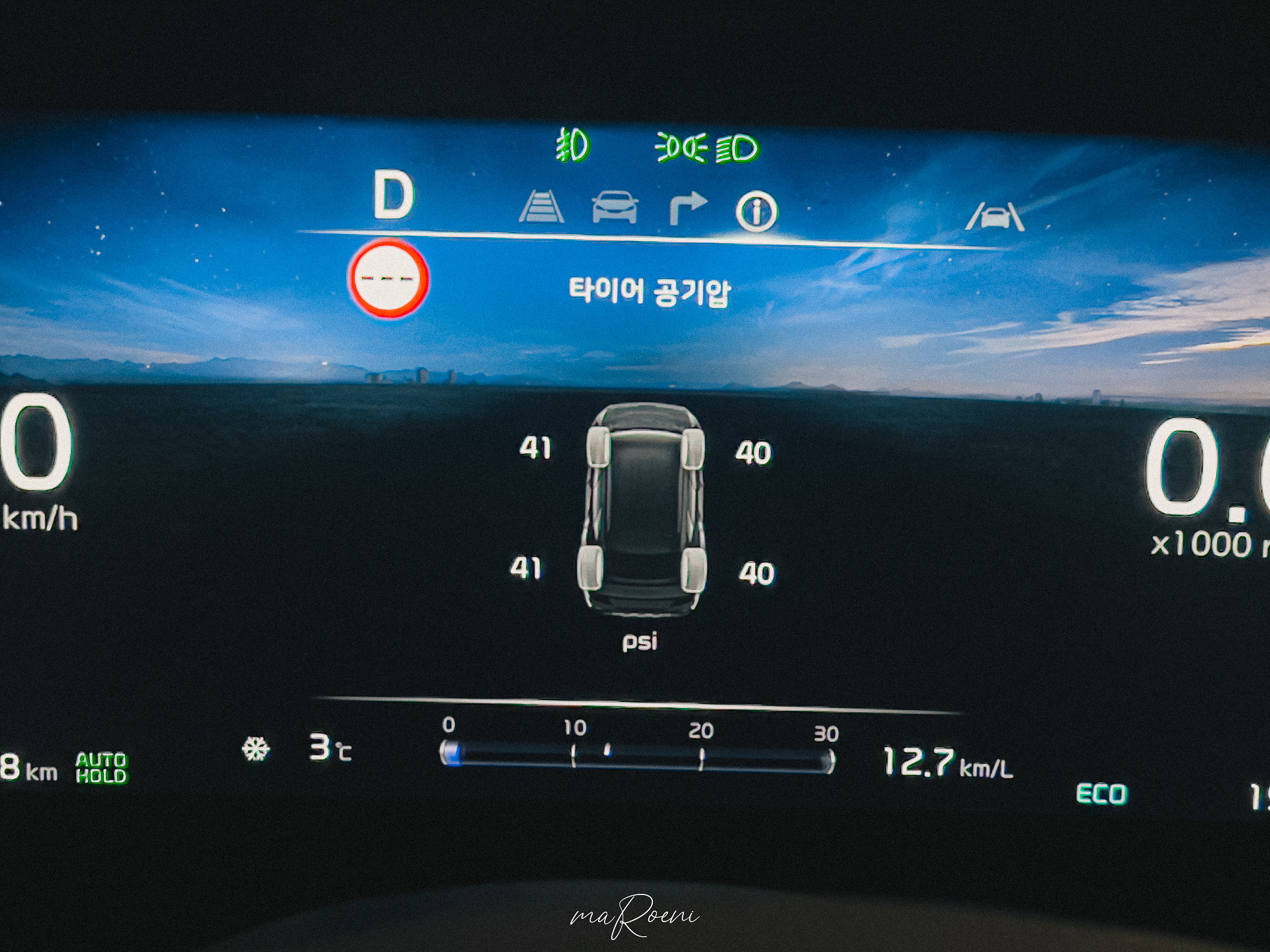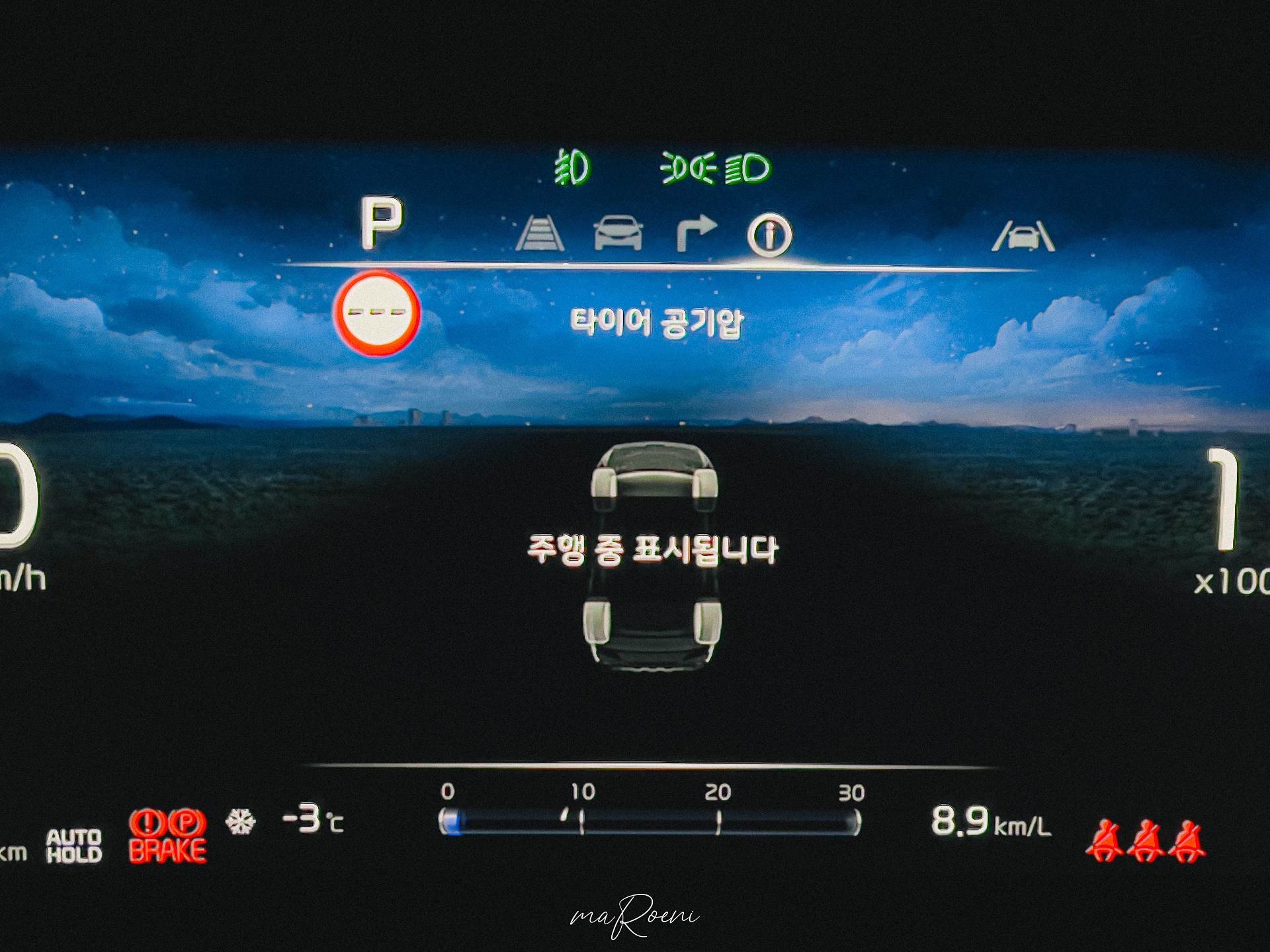 공기압 주입이 끝나고 차량에 들어가서 확인을 해보려고 하는데.. 내가 타고 있는 스포티지 NQ5는 약간의 주행을 해주어야 공기압 상태가 확인된다고 한다.
